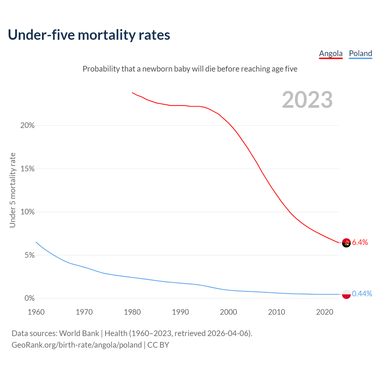 The chance that a newborn baby will die before reaching age five is 6.4% in Angola and 0.44% in Poland. Above is a chart with historical data on under-five mortality rates.