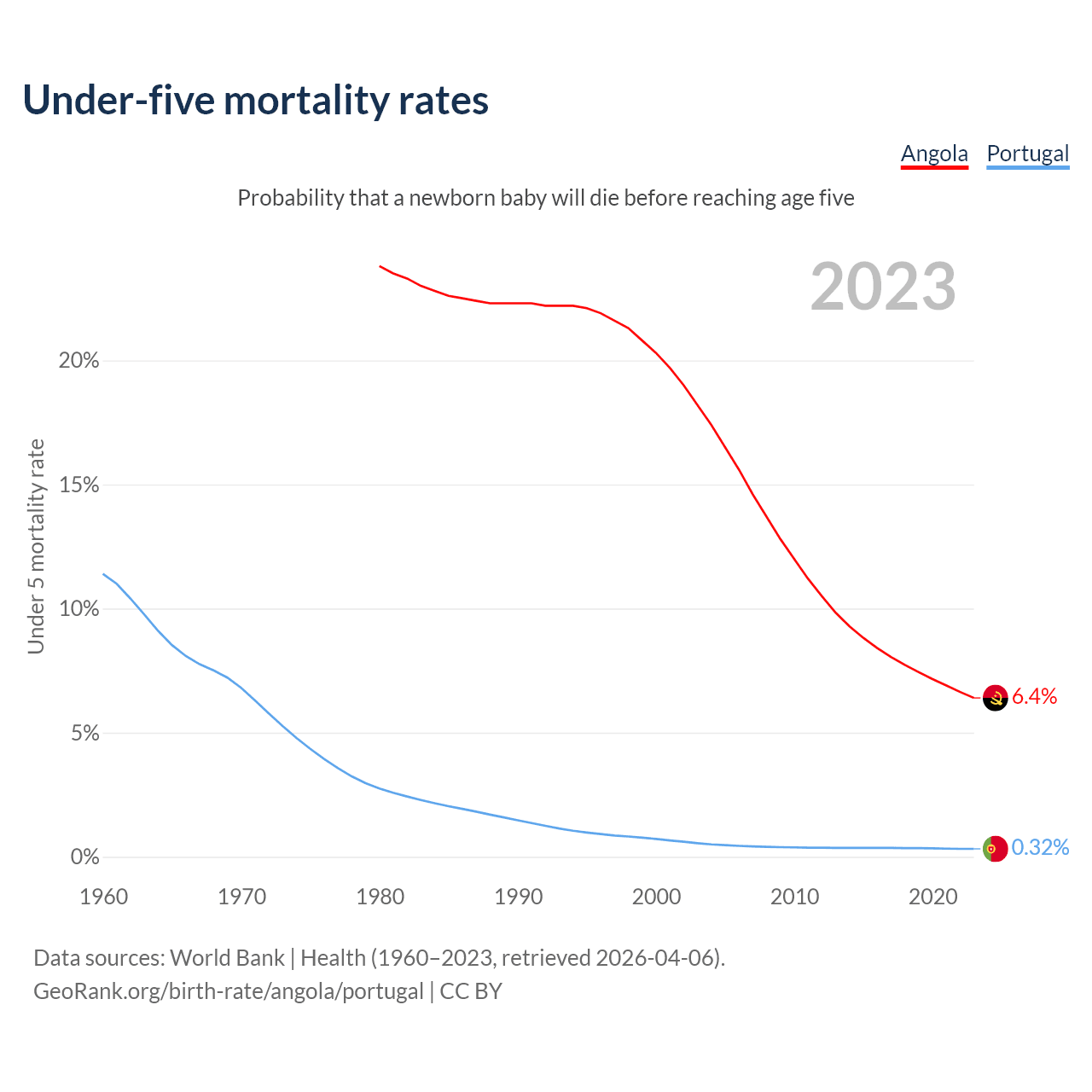 The chance that a newborn baby will die before reaching age five is 6.4% in Angola and 0.32% in Portugal. Above is a chart with historical data on under-five mortality rates.