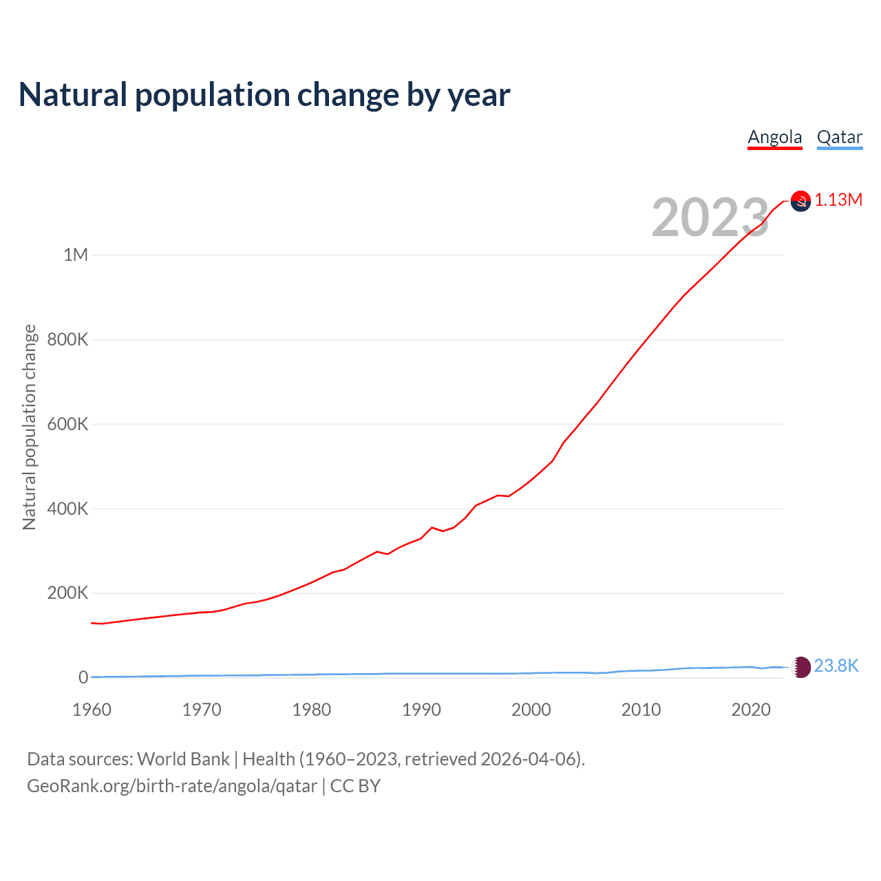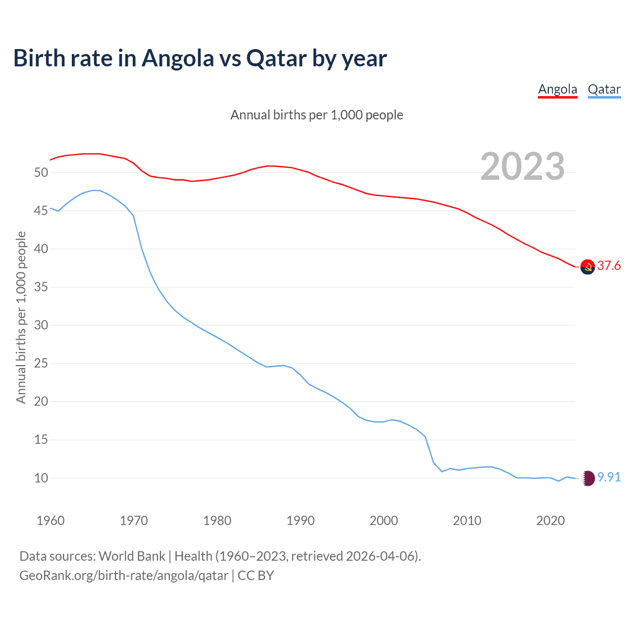 Angola has an annual birth rate of 37.6 births per 1,000 people, compared to 9.91 for Qatar. The average number of children a woman is expected to have during her lifetime — the fertility rate, is 5.12 in Angola and 1.73 in Qatar — 66.3% difference.