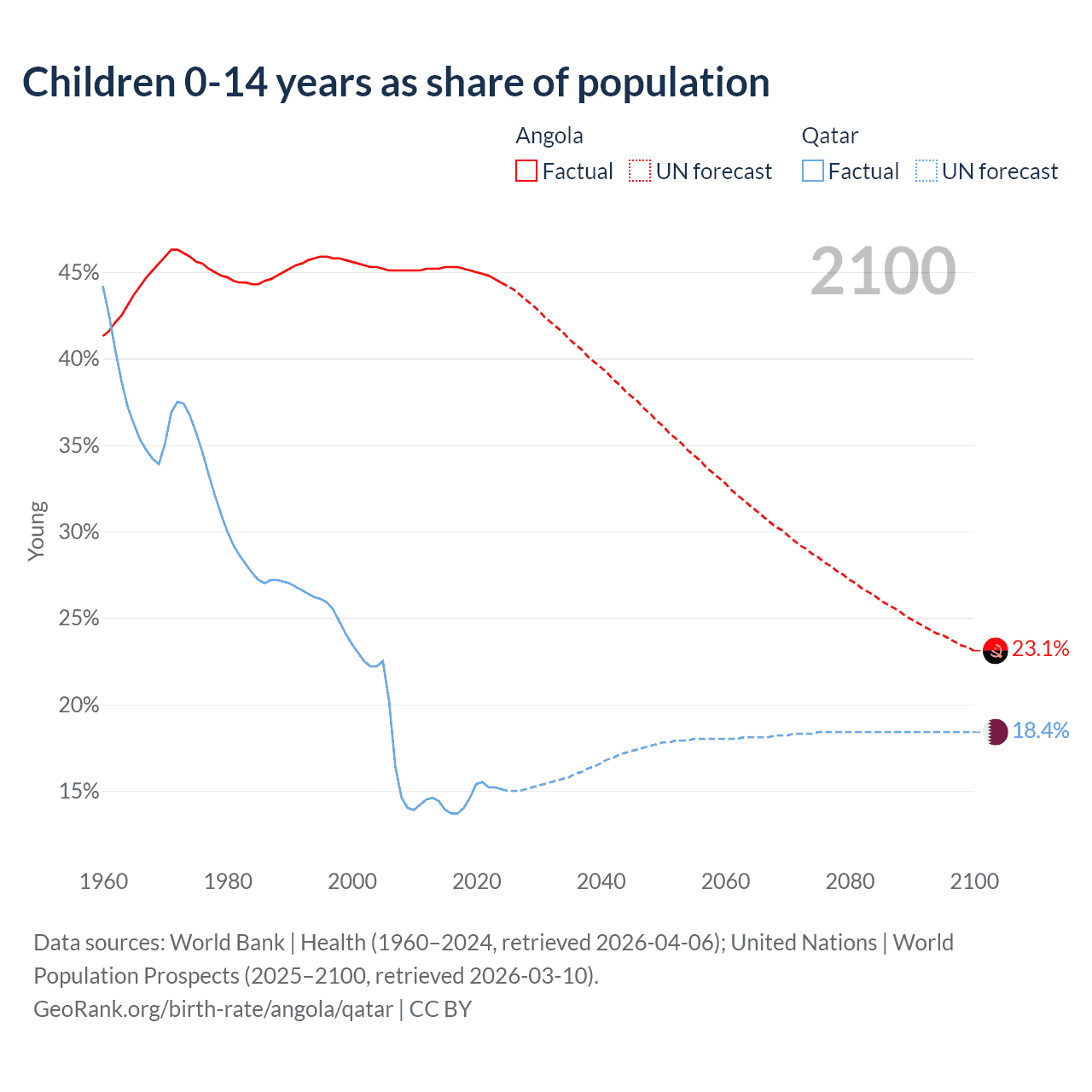 According to the latest available data on birth rates, the fertility rate in Angola was 5.12 children per woman in 2023, compared to 1.73 in Qatar in 2023. The replacement level is considered to be 2.1 children per woman.