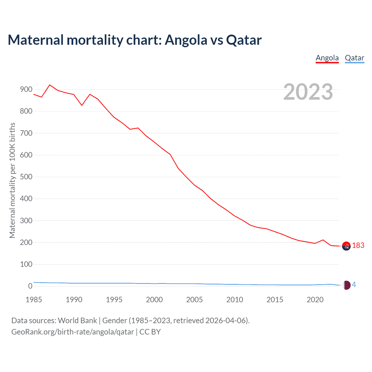 The maternal mortality rate, which is the probability of dying during childbirth or within 42 days of pregnancy termination, is 183 deaths per 100,000 live births in Angola, compared to 4 deaths in Qatar.