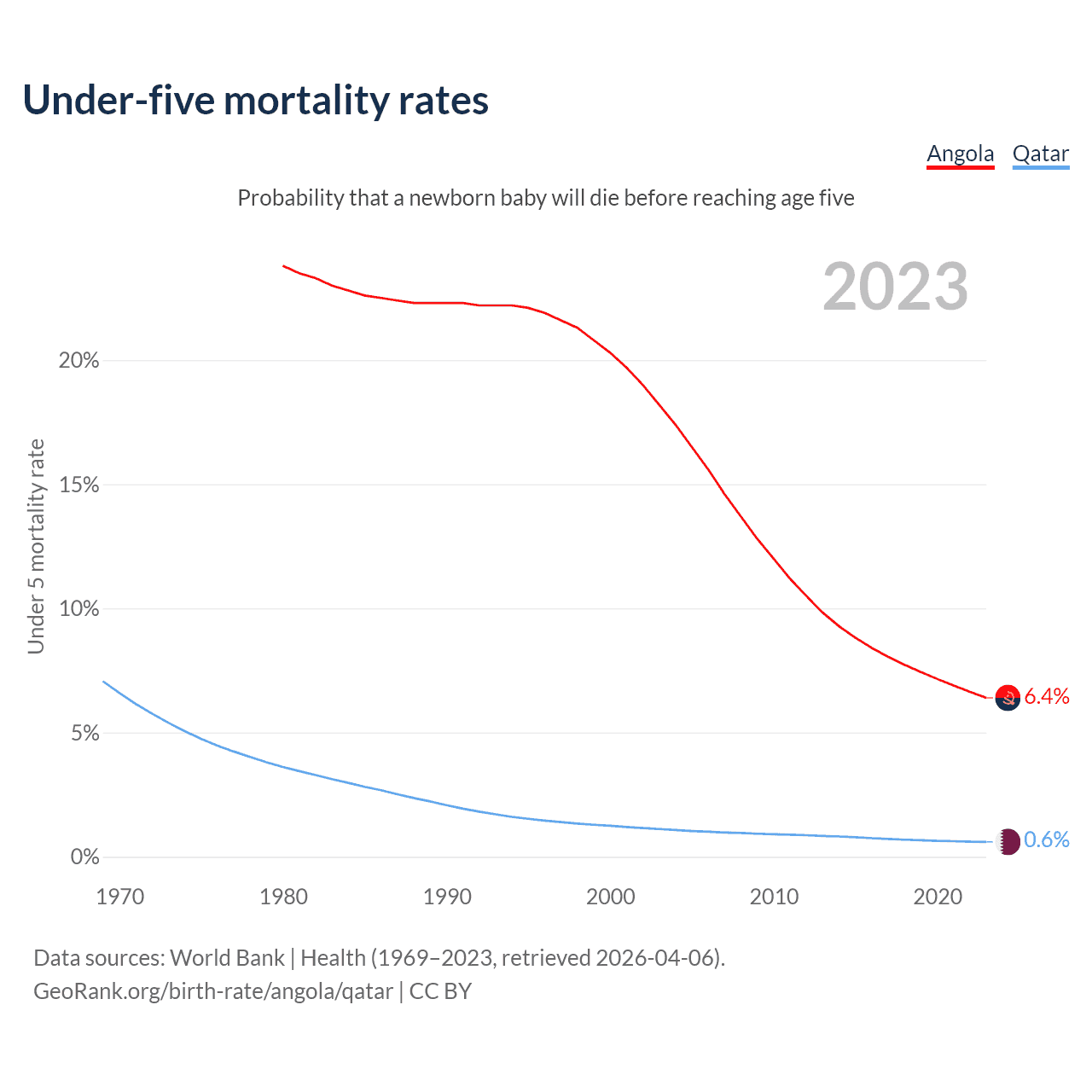 The chance that a newborn baby will die before reaching age five is 6.4% in Angola and 0.6% in Qatar. Above is a chart with historical data on under-five mortality rates.