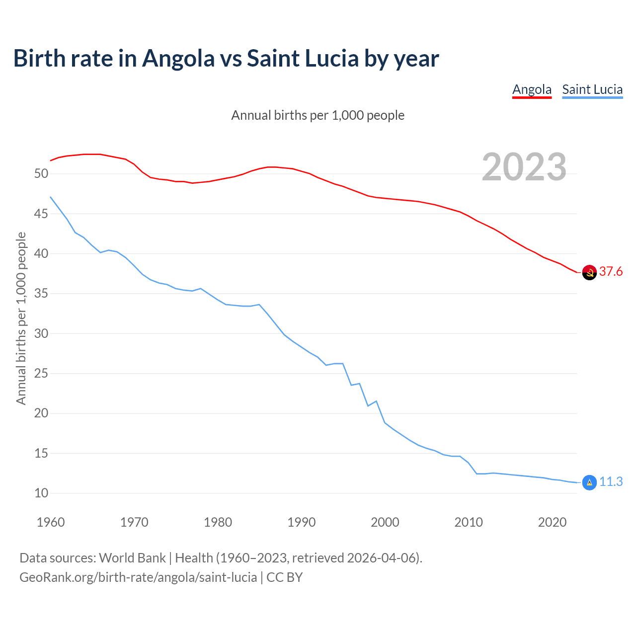 Angola has an annual birth rate of 37.6 births per 1,000 people, compared to 11.3 for Saint Lucia. The average number of children a woman is expected to have during her lifetime — the fertility rate, is 5.12 in Angola and 1.38 in Saint Lucia — 73.1% difference.