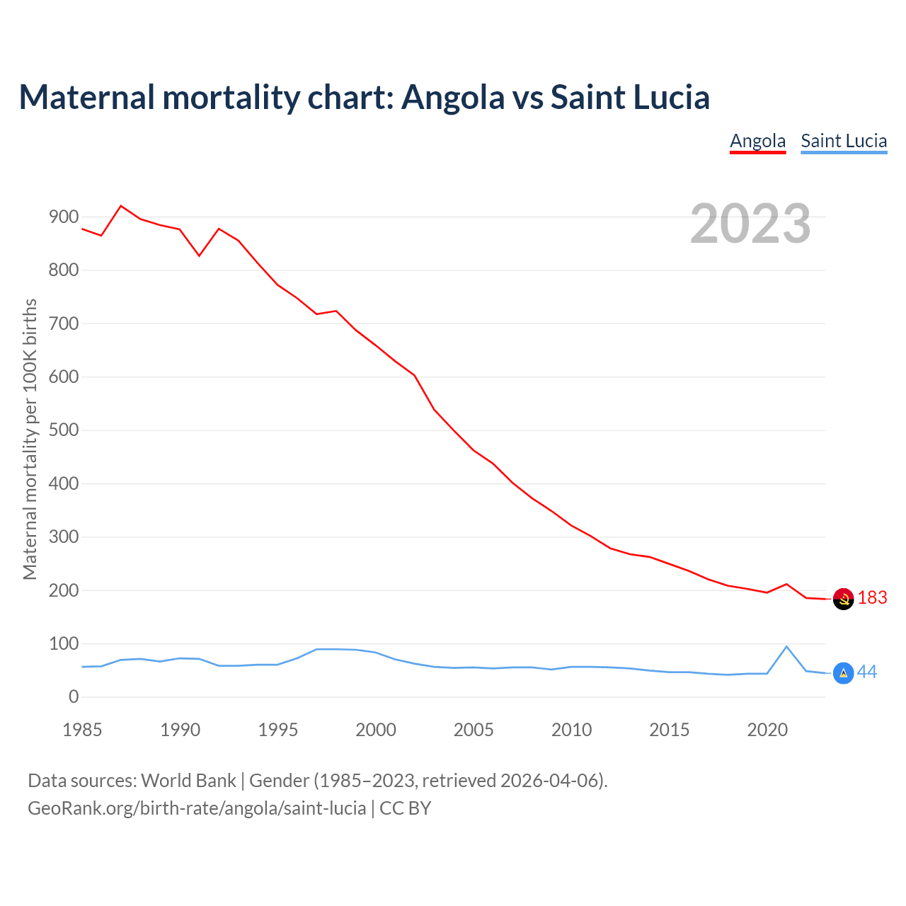 The maternal mortality rate, which is the probability of dying during childbirth or within 42 days of pregnancy termination, is 183 deaths per 100,000 live births in Angola, compared to 44 deaths in Saint Lucia.