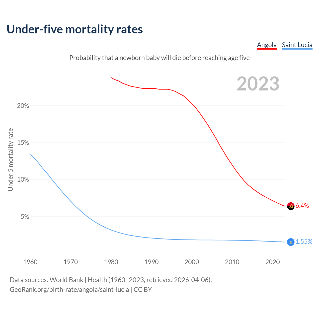 The chance that a newborn baby will die before reaching age five is 6.4% in Angola and 1.55% in Saint Lucia. Above is a chart with historical data on under-five mortality rates.