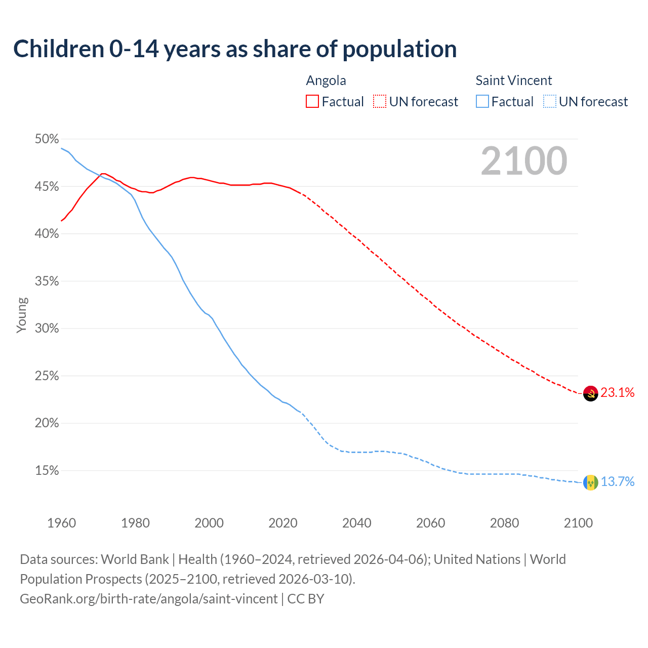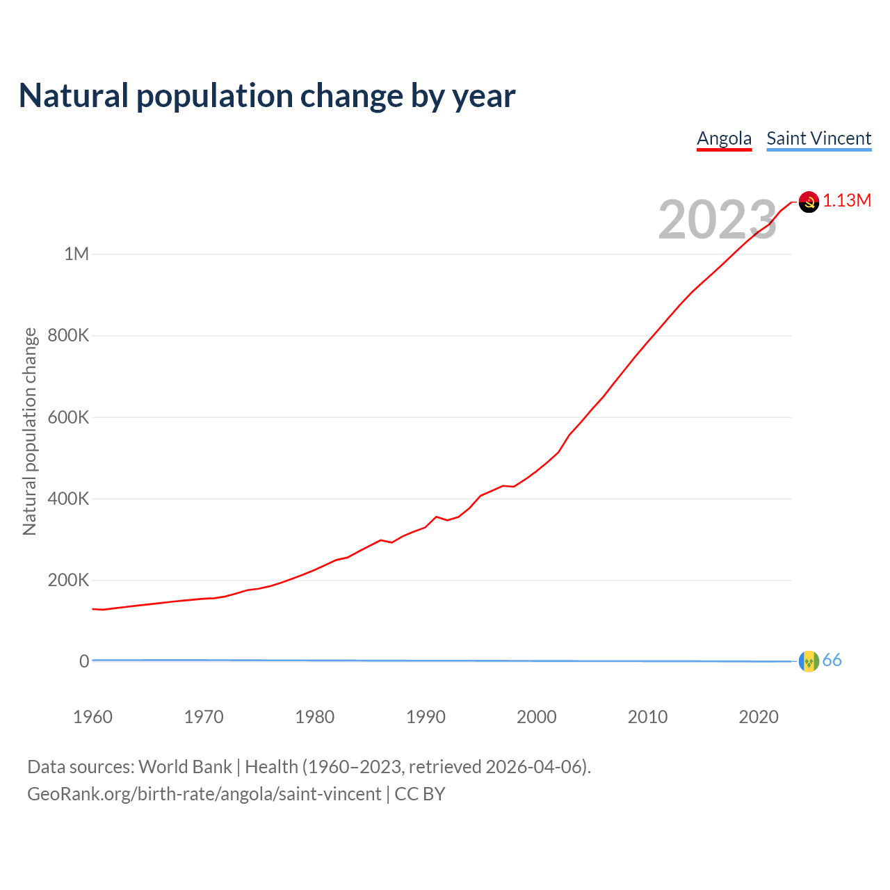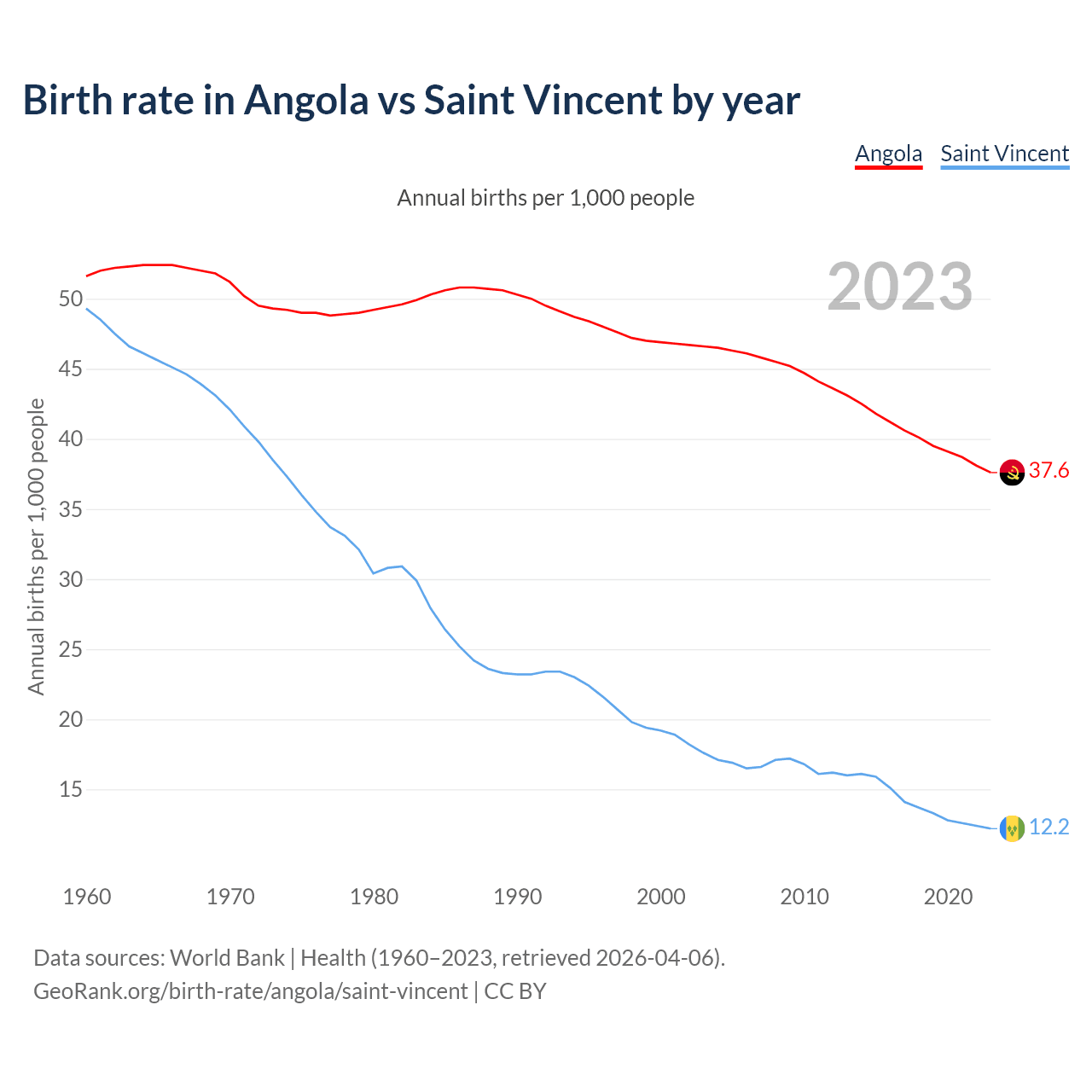 Angola has an annual birth rate of 37.6 births per 1,000 people, compared to 12.2 for Saint Vincent. The average number of children a woman is expected to have during her lifetime — the fertility rate, is 5.12 in Angola and 1.78 in Saint Vincent — 65.4% difference.