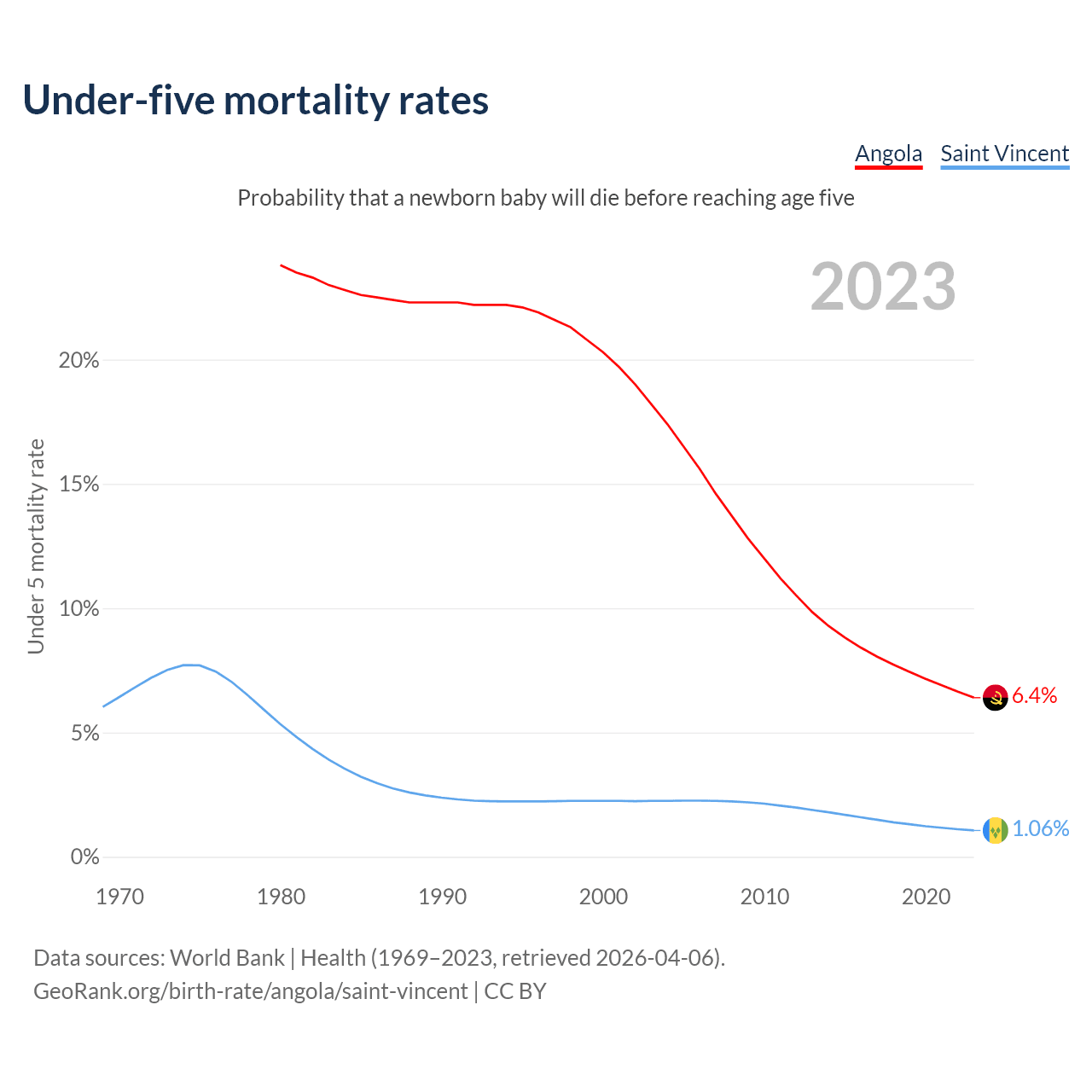 The chance that a newborn baby will die before reaching age five is 6.4% in Angola and 1.06% in Saint Vincent. Above is a chart with historical data on under-five mortality rates.