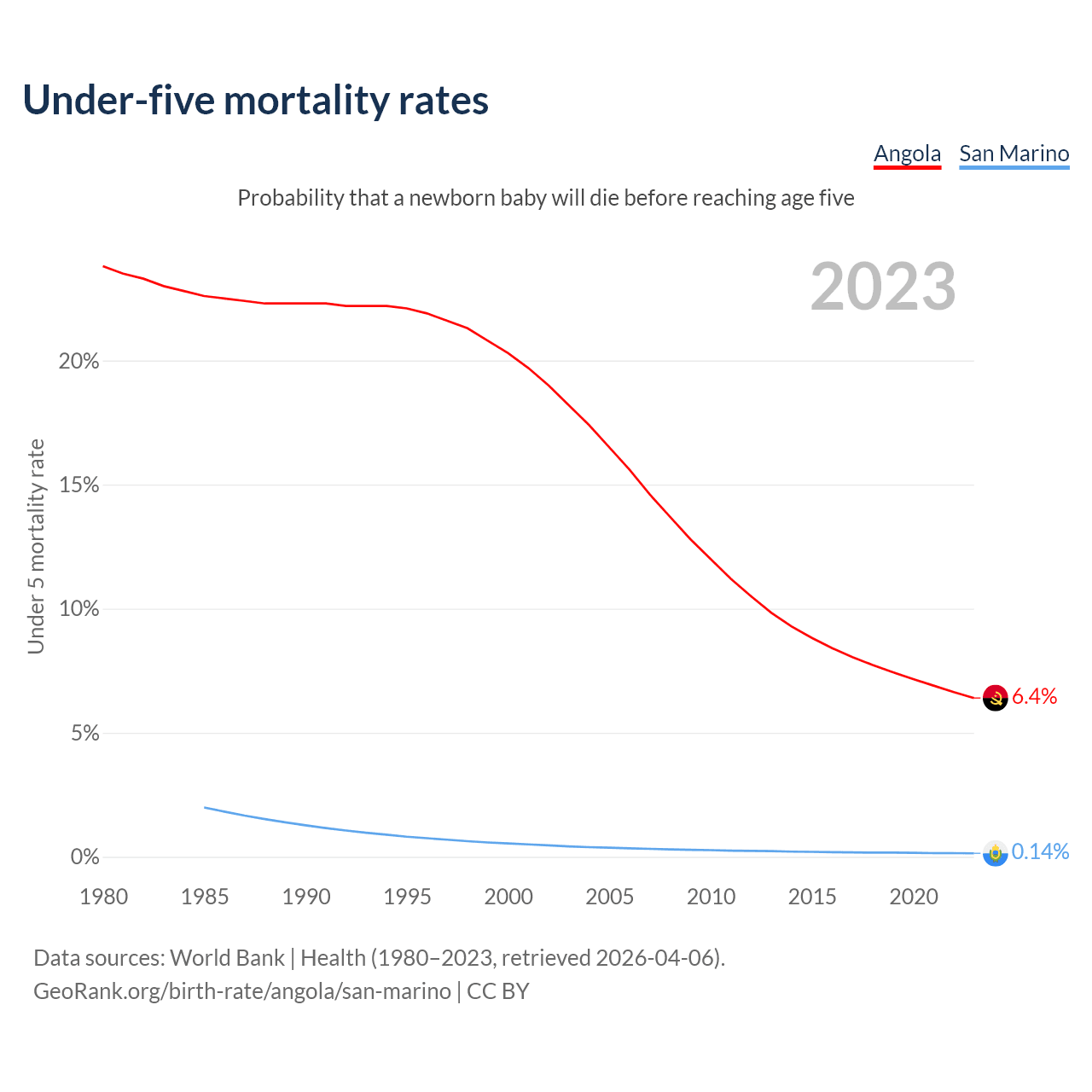 The chance that a newborn baby will die before reaching age five is 6.4% in Angola and 0.14% in San Marino. Above is a chart with historical data on under-five mortality rates.