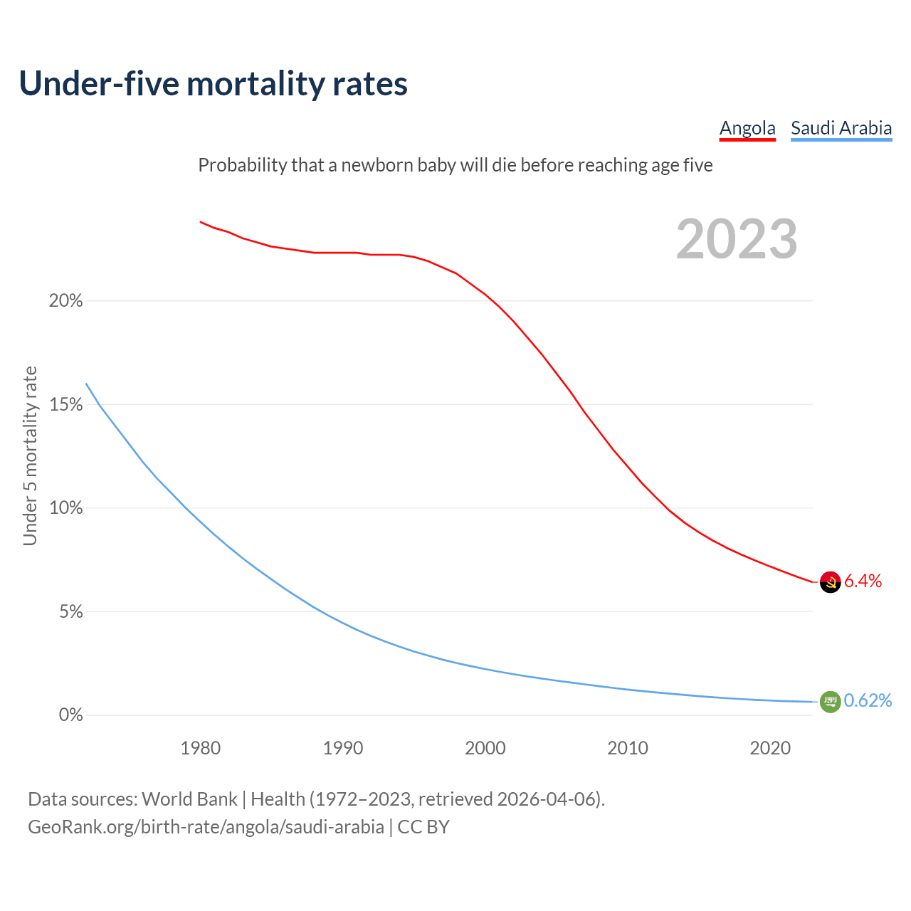 The chance that a newborn baby will die before reaching age five is 6.4% in Angola and 0.62% in Saudi Arabia. Above is a chart with historical data on under-five mortality rates.