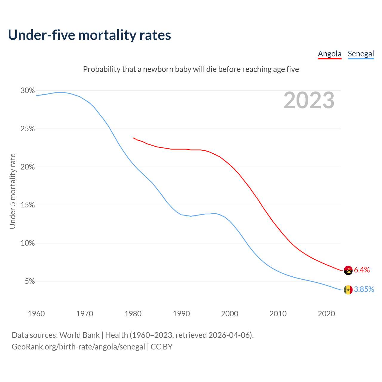 The chance that a newborn baby will die before reaching age five is 6.4% in Angola and 3.85% in Senegal. Above is a chart with historical data on under-five mortality rates.