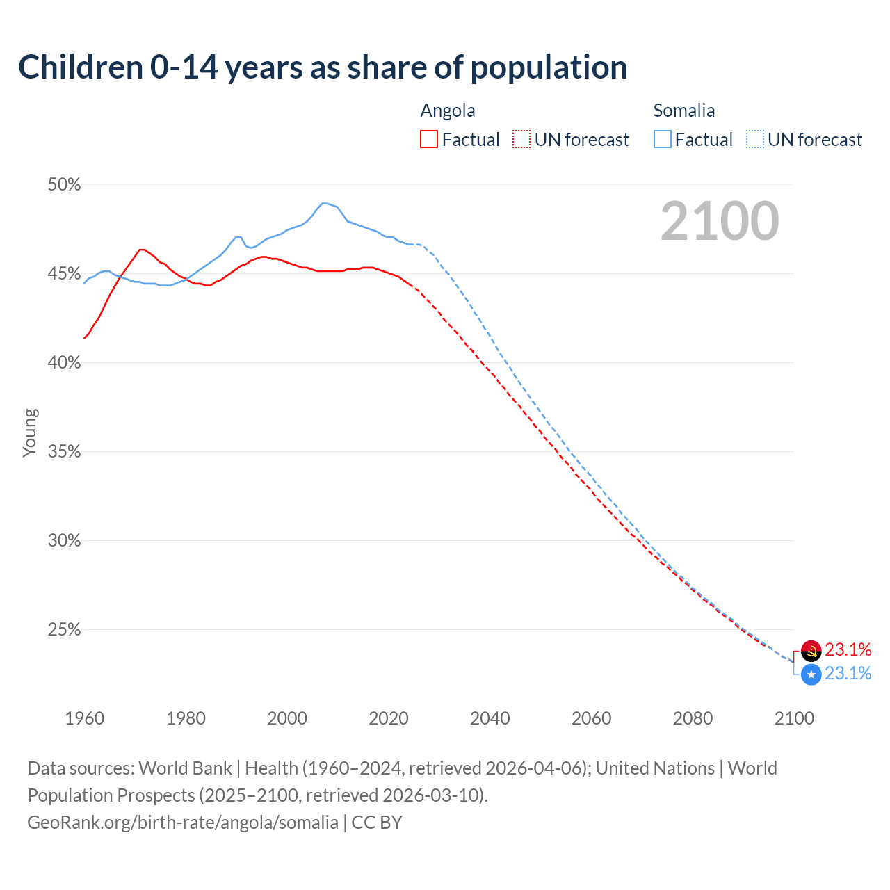 1960 vs 2023, the fertility rate has decreased by 23.6% in Angola and by 15.4% in Somalia — in 1960, it was 6.71 and 7.25, respectively.