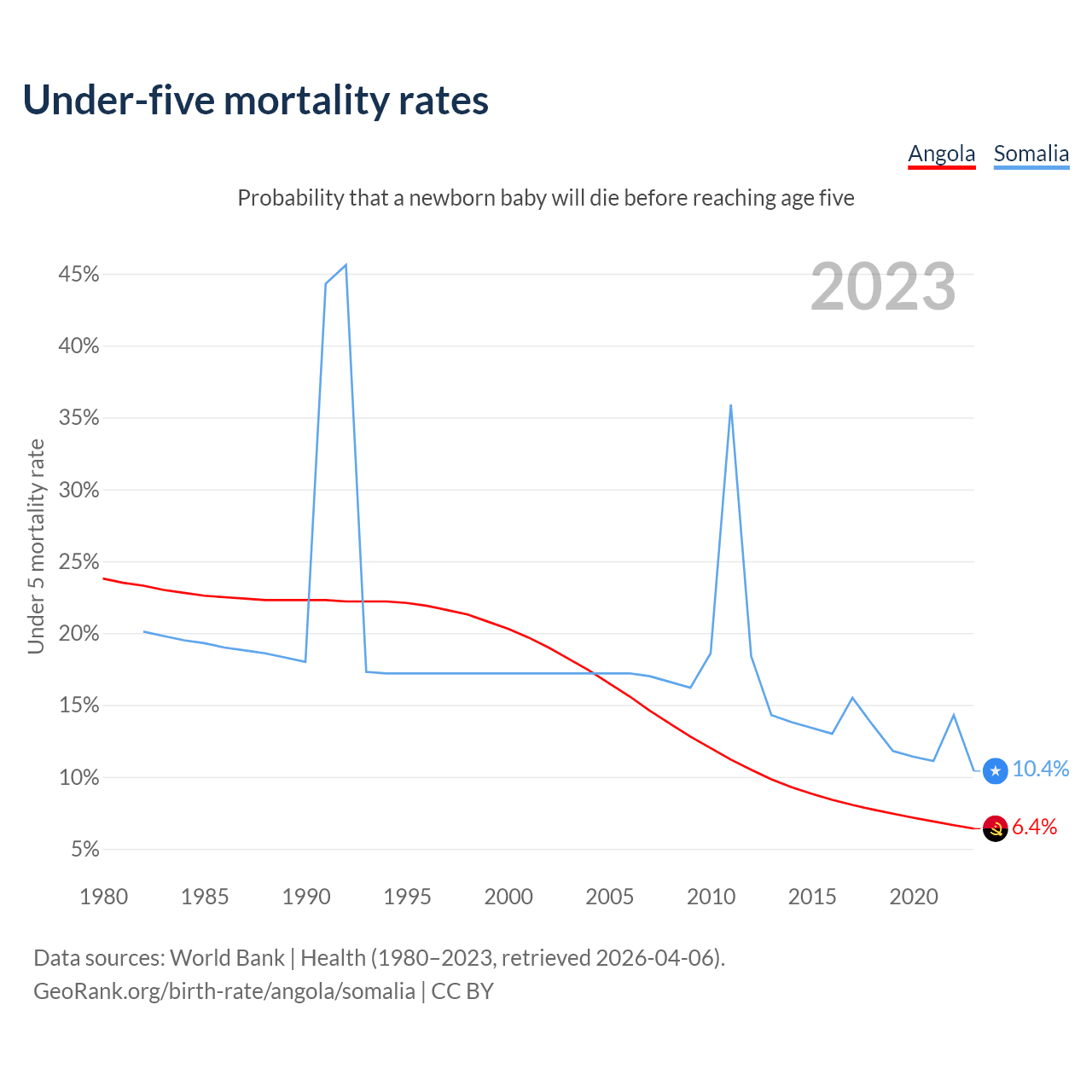 The chance that a newborn baby will die before reaching age five is 6.4% in Angola and 10.4% in Somalia. Above is a chart with historical data on under-five mortality rates.