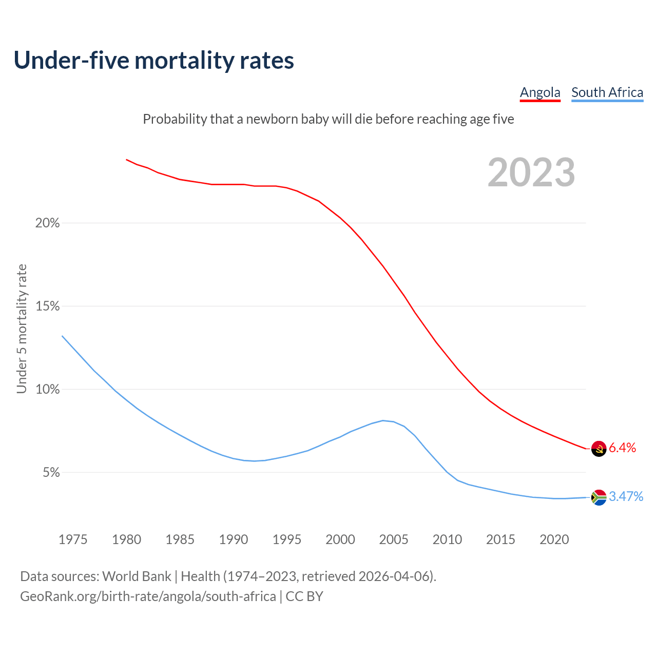 The chance that a newborn baby will die before reaching age five is 6.4% in Angola and 3.47% in South Africa. Above is a chart with historical data on under-five mortality rates.
