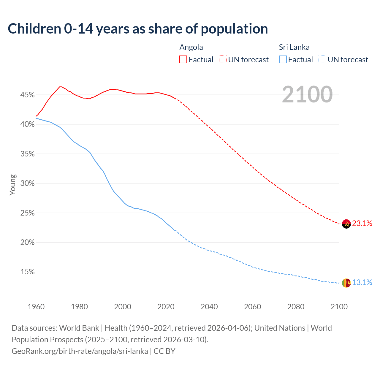 Angola has an annual birth rate of 37.6 births per 1,000 people, compared to 11.2 for Sri Lanka. The average number of children a woman is expected to have during her lifetime — the fertility rate, is 5.12 in Angola and 1.97 in Sri Lanka — 61.5% difference.