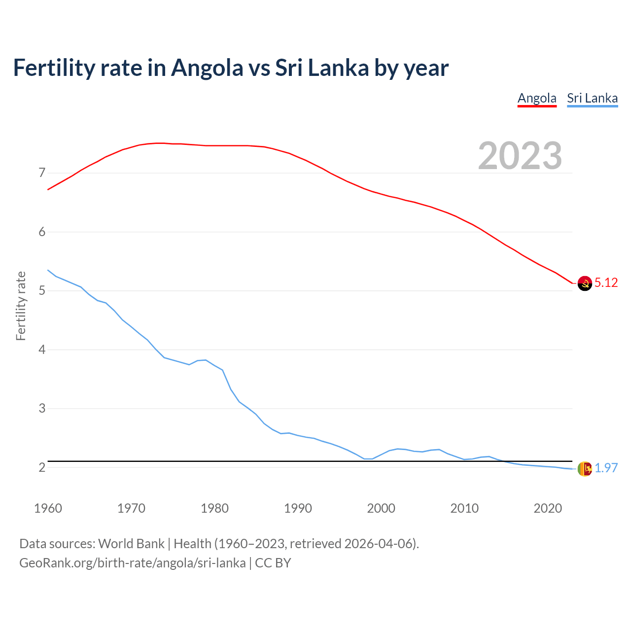 1960 vs 2023, the fertility rate has decreased by 23.6% in Angola and by 63.1% in Sri Lanka — in 1960, it was 6.71 and 5.35, respectively.