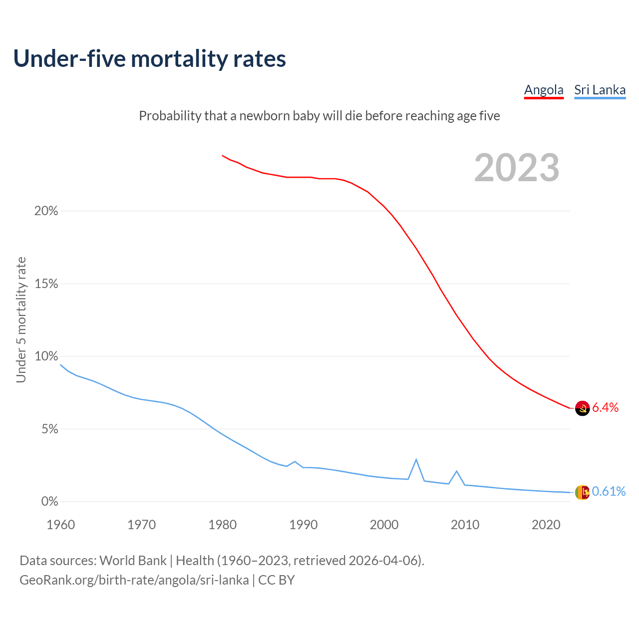 The chance that a newborn baby will die before reaching age five is 6.4% in Angola and 0.61% in Sri Lanka. Above is a chart with historical data on under-five mortality rates.