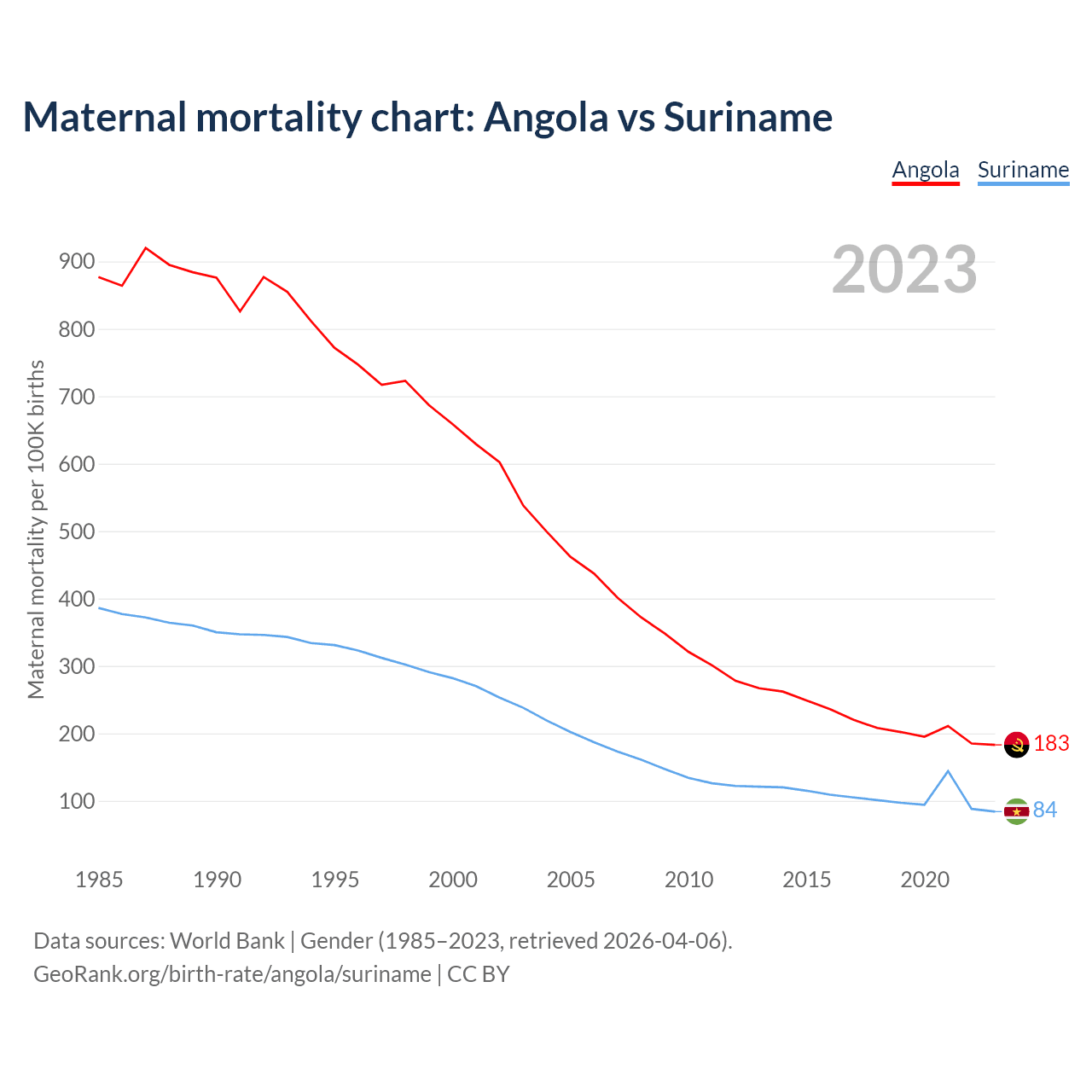 The maternal mortality rate, which is the probability of dying during childbirth or within 42 days of pregnancy termination, is 183 deaths per 100,000 live births in Angola, compared to 84 deaths in Suriname.