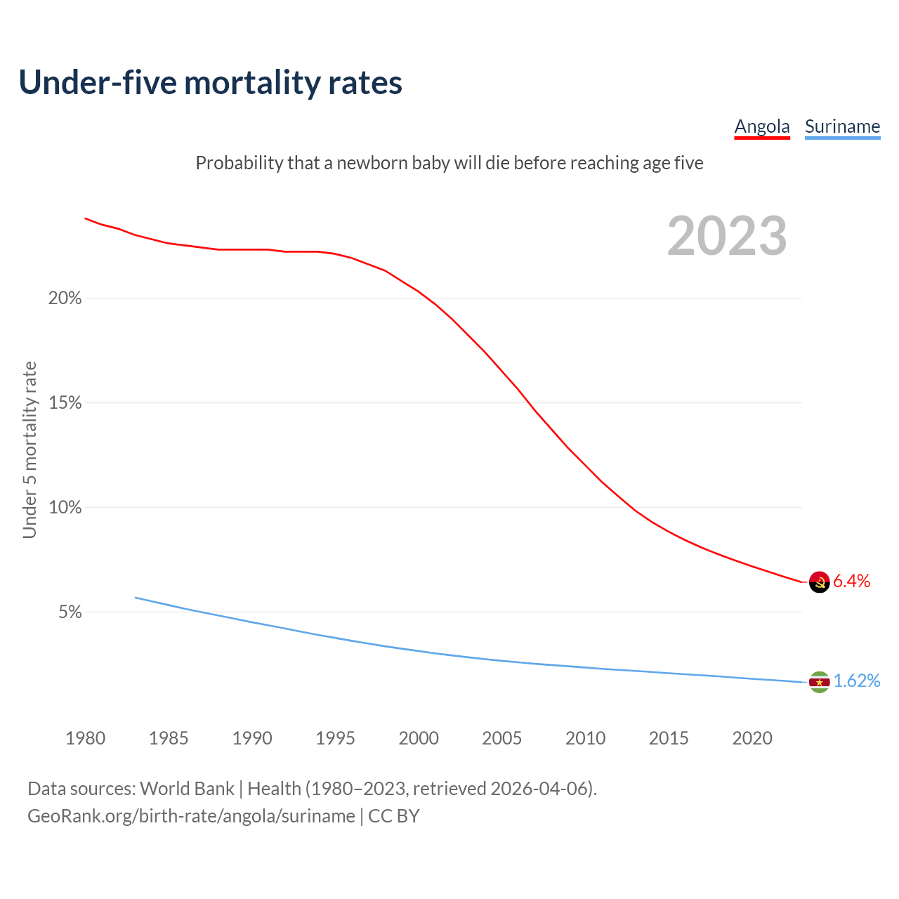The chance that a newborn baby will die before reaching age five is 6.4% in Angola and 1.62% in Suriname. Above is a chart with historical data on under-five mortality rates.