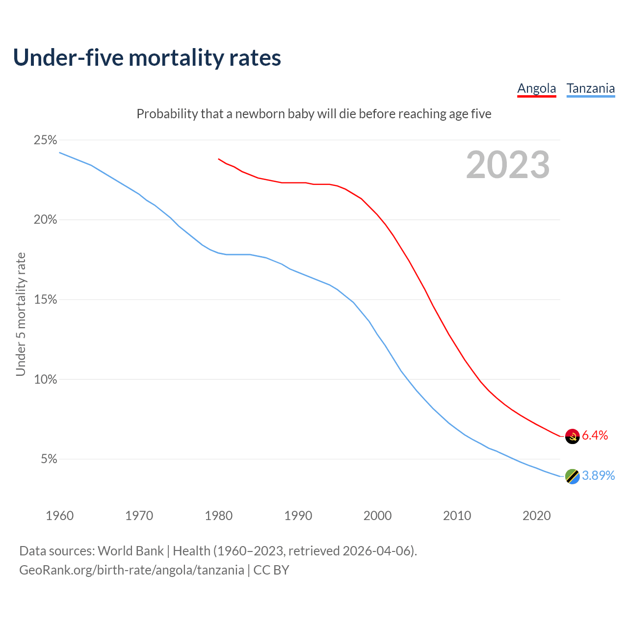 The chance that a newborn baby will die before reaching age five is 6.4% in Angola and 3.89% in Tanzania. Above is a chart with historical data on under-five mortality rates.
