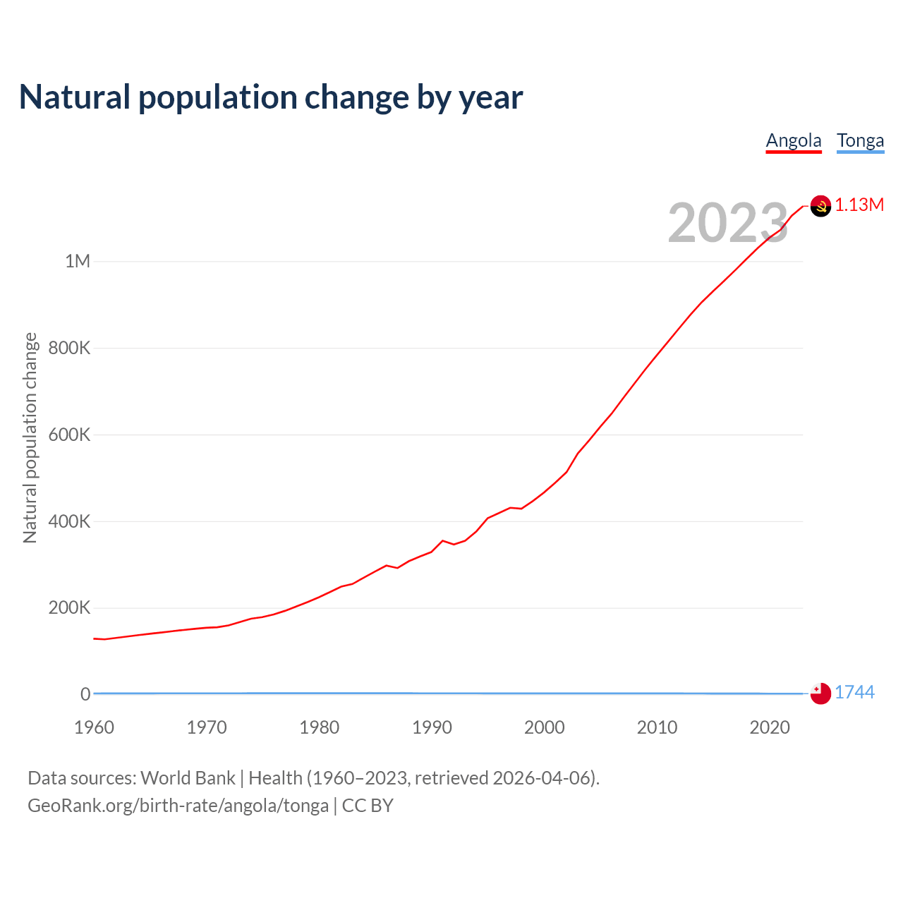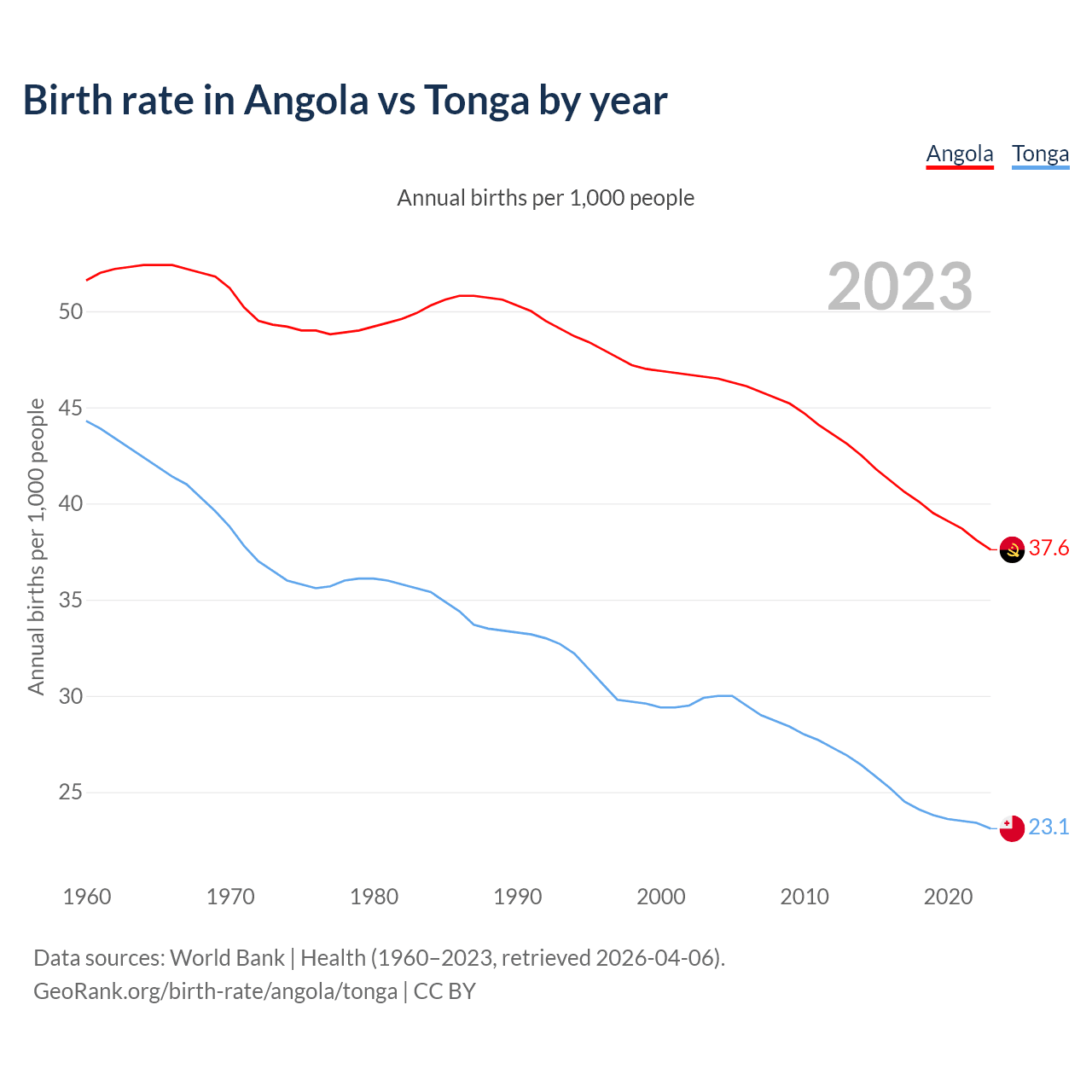 Angola has an annual birth rate of 37.6 births per 1,000 people, compared to 23.1 for Tonga. The average number of children a woman is expected to have during her lifetime — the fertility rate, is 5.12 in Angola and 3.13 in Tonga — 38.9% difference.