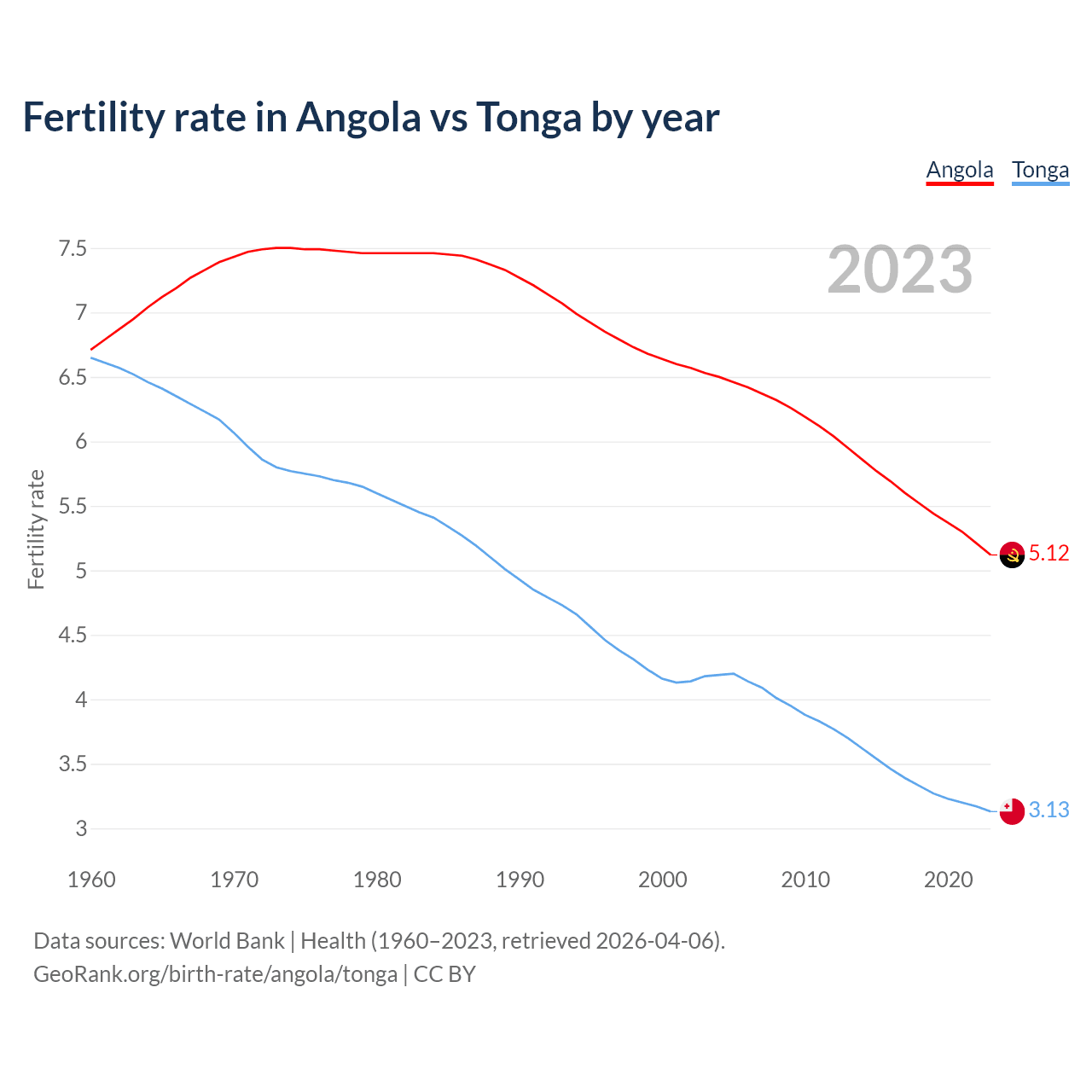 1960 vs 2023, the fertility rate has decreased by 23.6% in Angola and by 53% in Tonga — in 1960, it was 6.71 and 6.65, respectively.