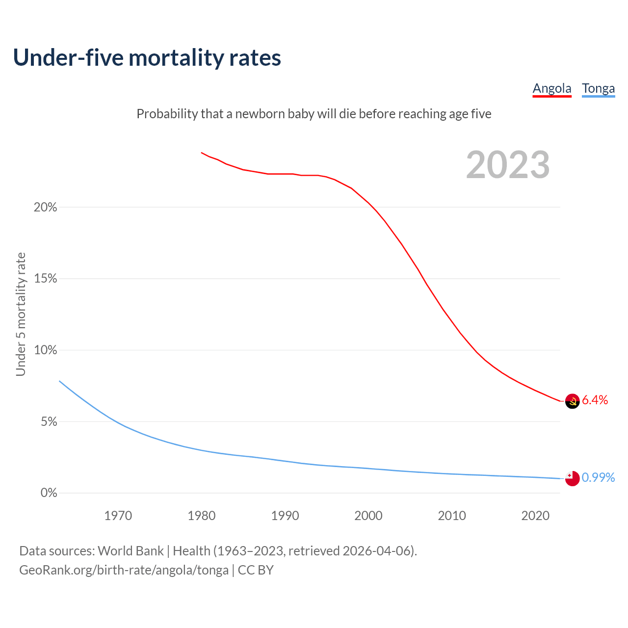 The chance that a newborn baby will die before reaching age five is 6.4% in Angola and 0.99% in Tonga. Above is a chart with historical data on under-five mortality rates.