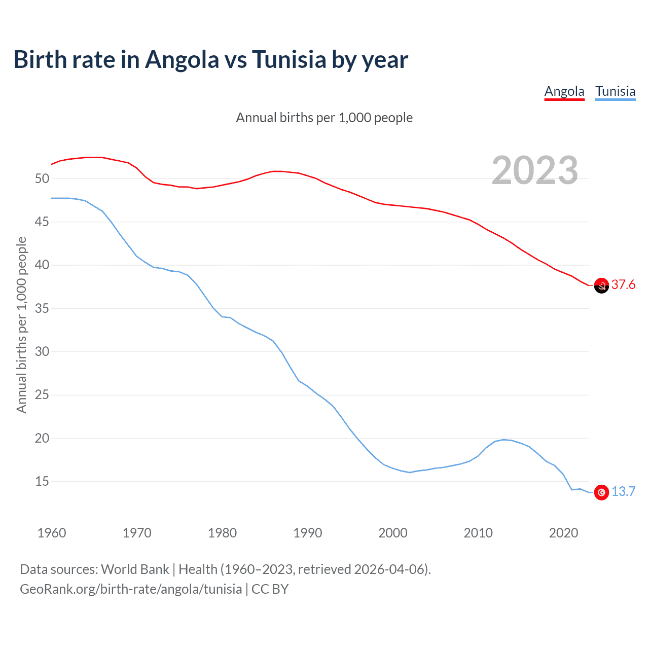 Angola has an annual birth rate of 37.6 births per 1,000 people, compared to 13.7 for Tunisia. The average number of children a woman is expected to have during her lifetime — the fertility rate, is 5.12 in Angola and 1.83 in Tunisia — 64.2% difference.