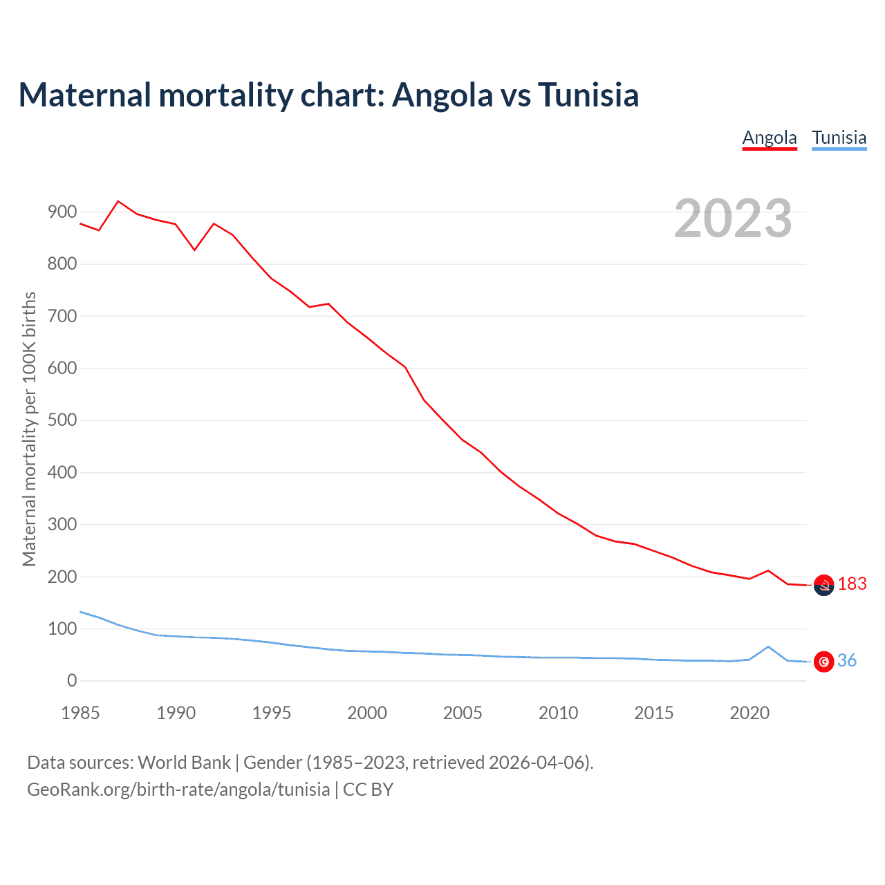 The maternal mortality rate, which is the probability of dying during childbirth or within 42 days of pregnancy termination, is 183 deaths per 100,000 live births in Angola, compared to 36 deaths in Tunisia.