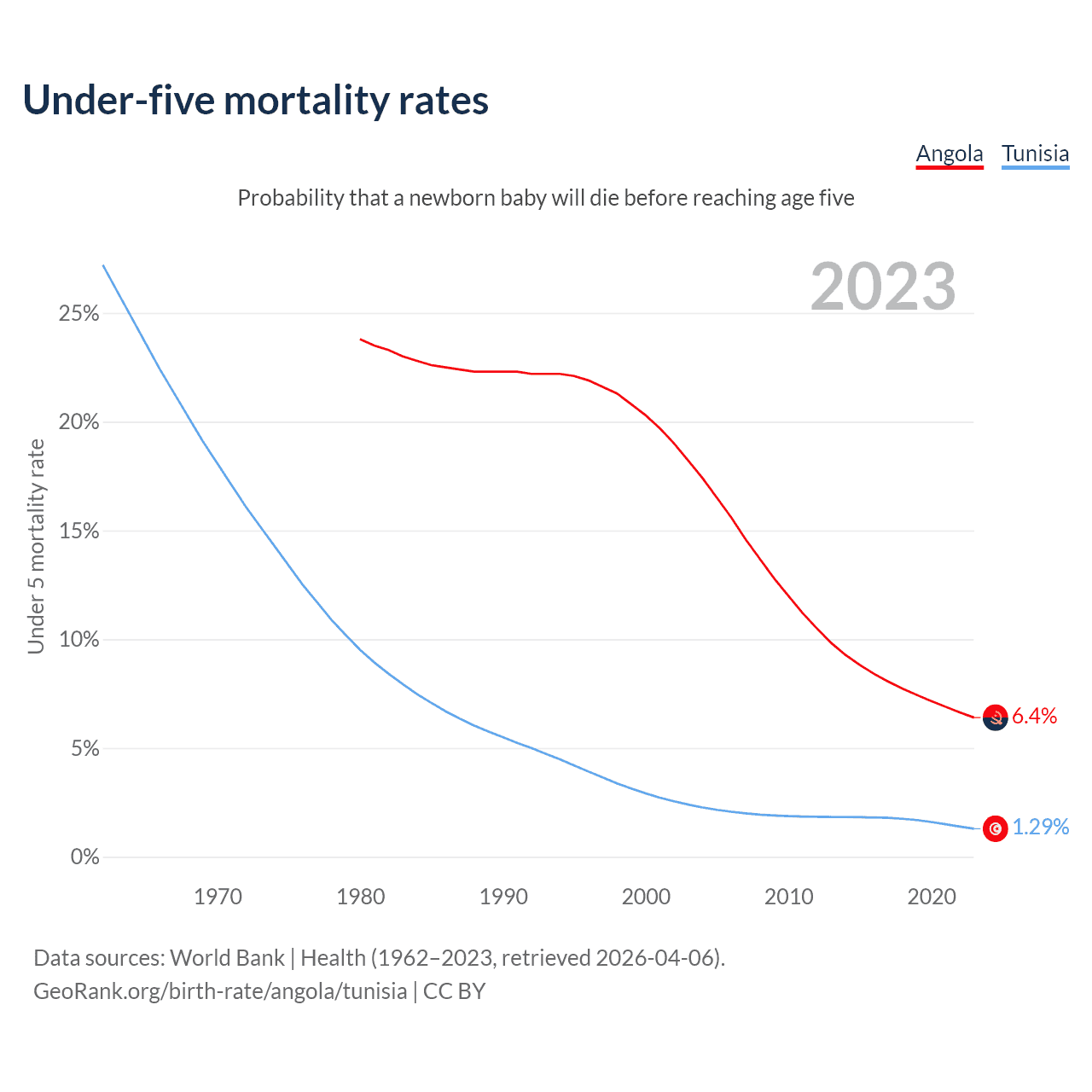 The chance that a newborn baby will die before reaching age five is 6.4% in Angola and 1.29% in Tunisia. Above is a chart with historical data on under-five mortality rates.