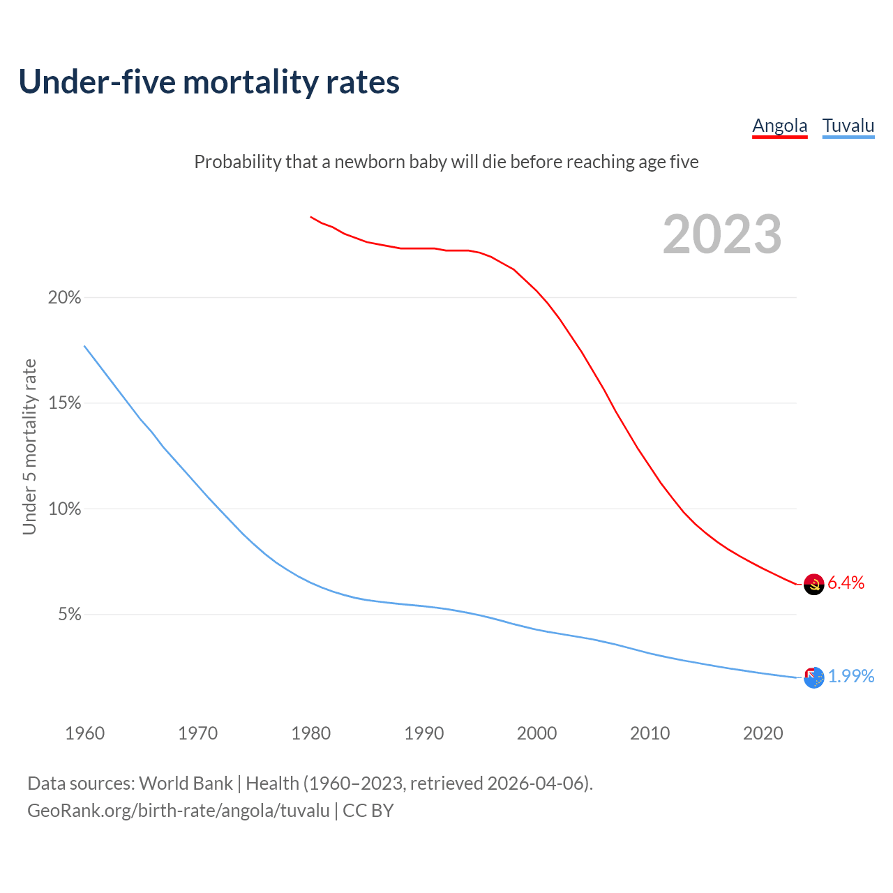 The chance that a newborn baby will die before reaching age five is 6.4% in Angola and 1.99% in Tuvalu. Above is a chart with historical data on under-five mortality rates.