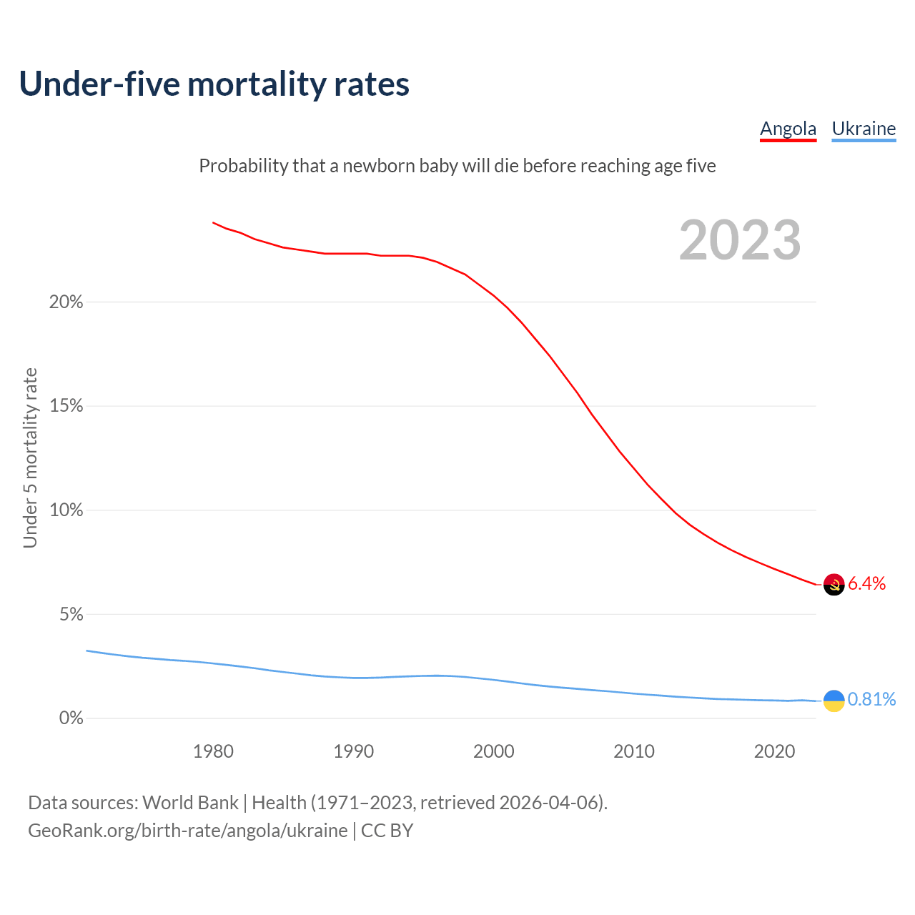 The chance that a newborn baby will die before reaching age five is 6.4% in Angola and 0.81% in Ukraine. Above is a chart with historical data on under-five mortality rates.