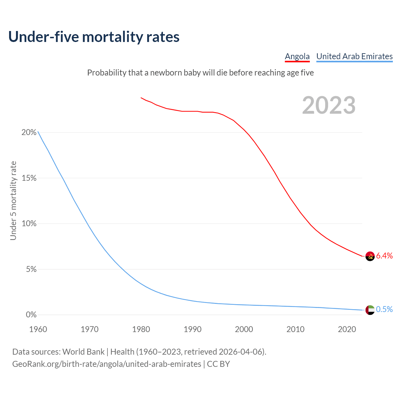 The chance that a newborn baby will die before reaching age five is 6.4% in Angola and 0.5% in the United Arab Emirates. Above is a chart with historical data on under-five mortality rates.