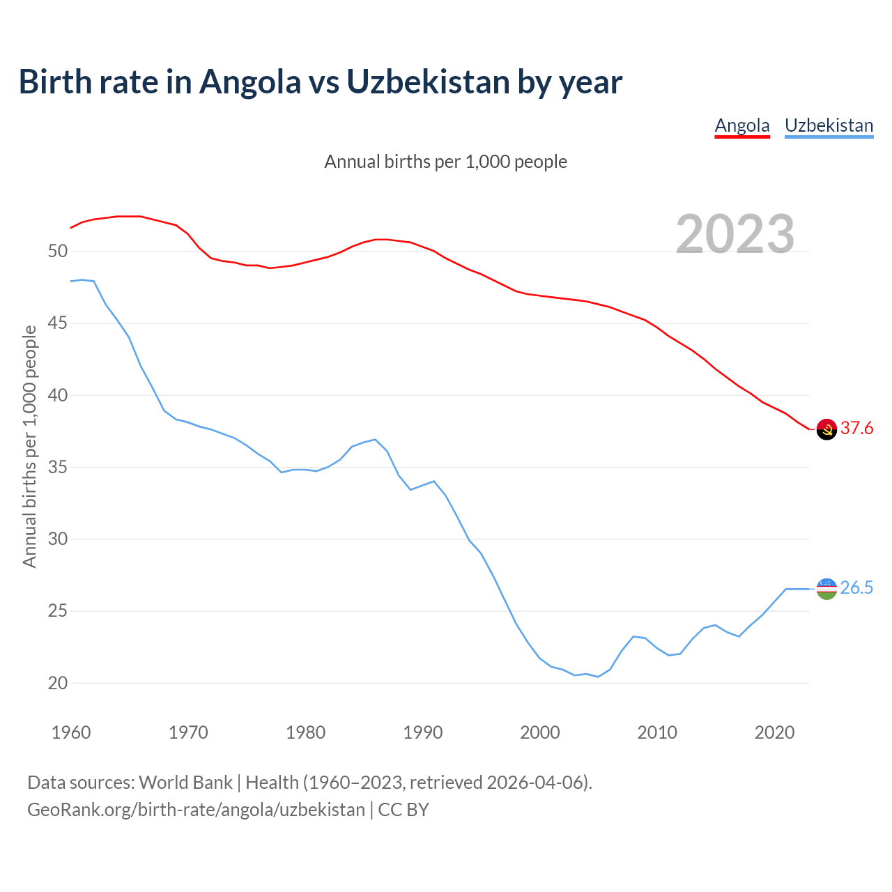 Angola has an annual birth rate of 37.6 births per 1,000 people, compared to 26.5 for Uzbekistan. The average number of children a woman is expected to have during her lifetime — the fertility rate, is 5.12 in Angola and 3.5 in Uzbekistan — 31.7% difference.