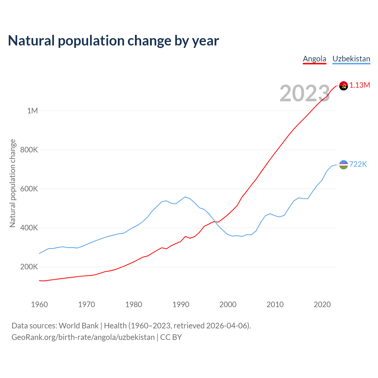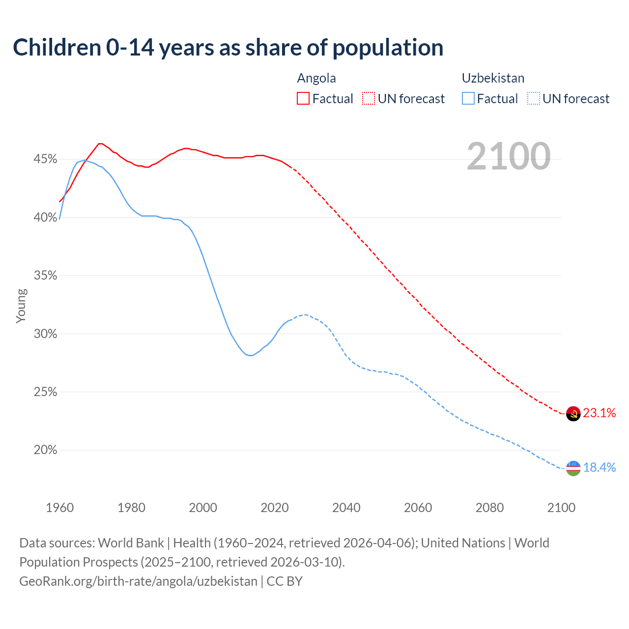 According to the latest available data on birth rates, the fertility rate in Angola was 5.12 children per woman in 2023, compared to 3.5 in Uzbekistan in 2023. The replacement level is considered to be 2.1 children per woman.