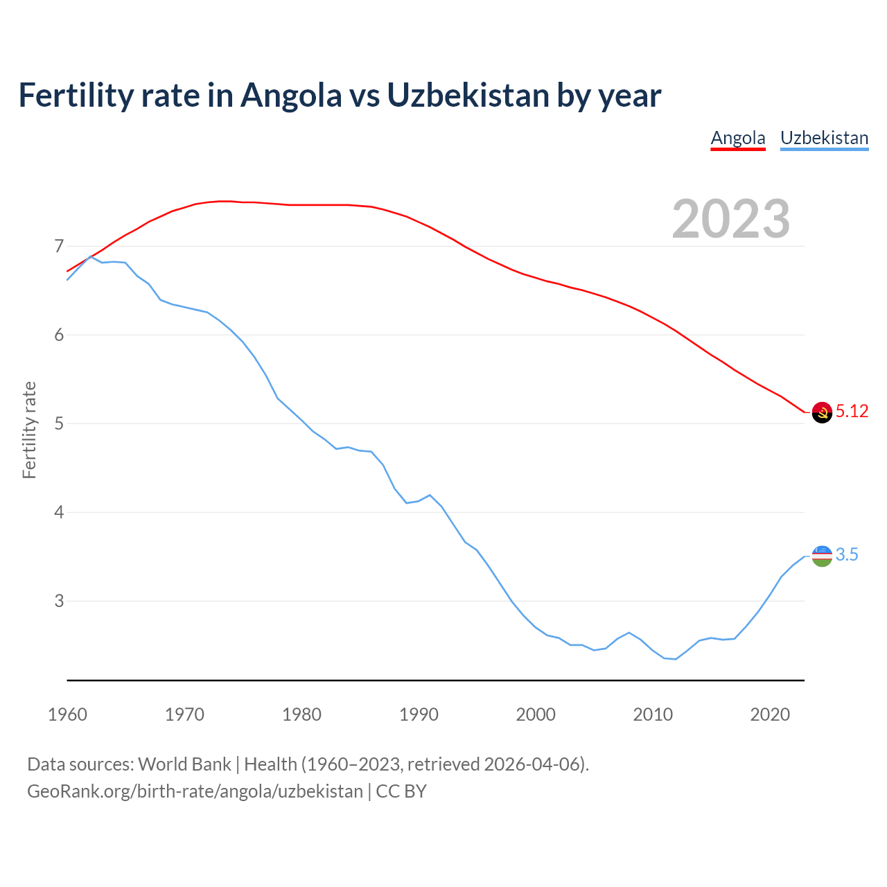 1960 vs 2023, the fertility rate has decreased by 23.6% in Angola and by 47.1% in Uzbekistan — in 1960, it was 6.71 and 6.61, respectively.