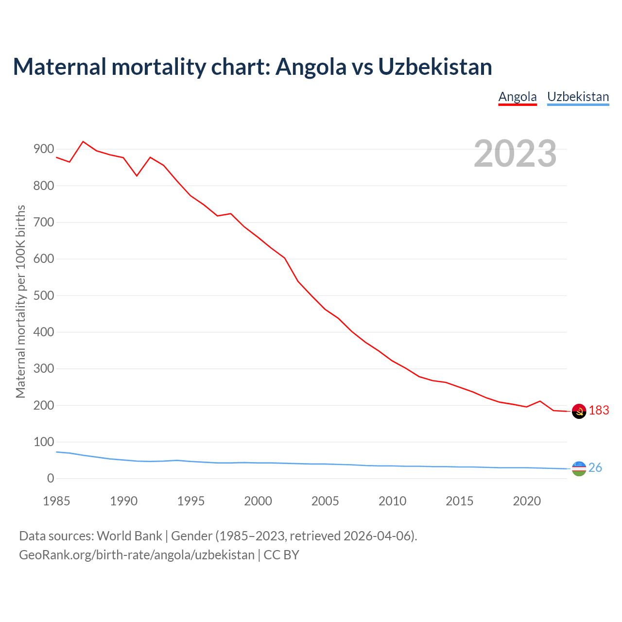The maternal mortality rate, which is the probability of dying during childbirth or within 42 days of pregnancy termination, is 183 deaths per 100,000 live births in Angola, compared to 26 deaths in Uzbekistan.