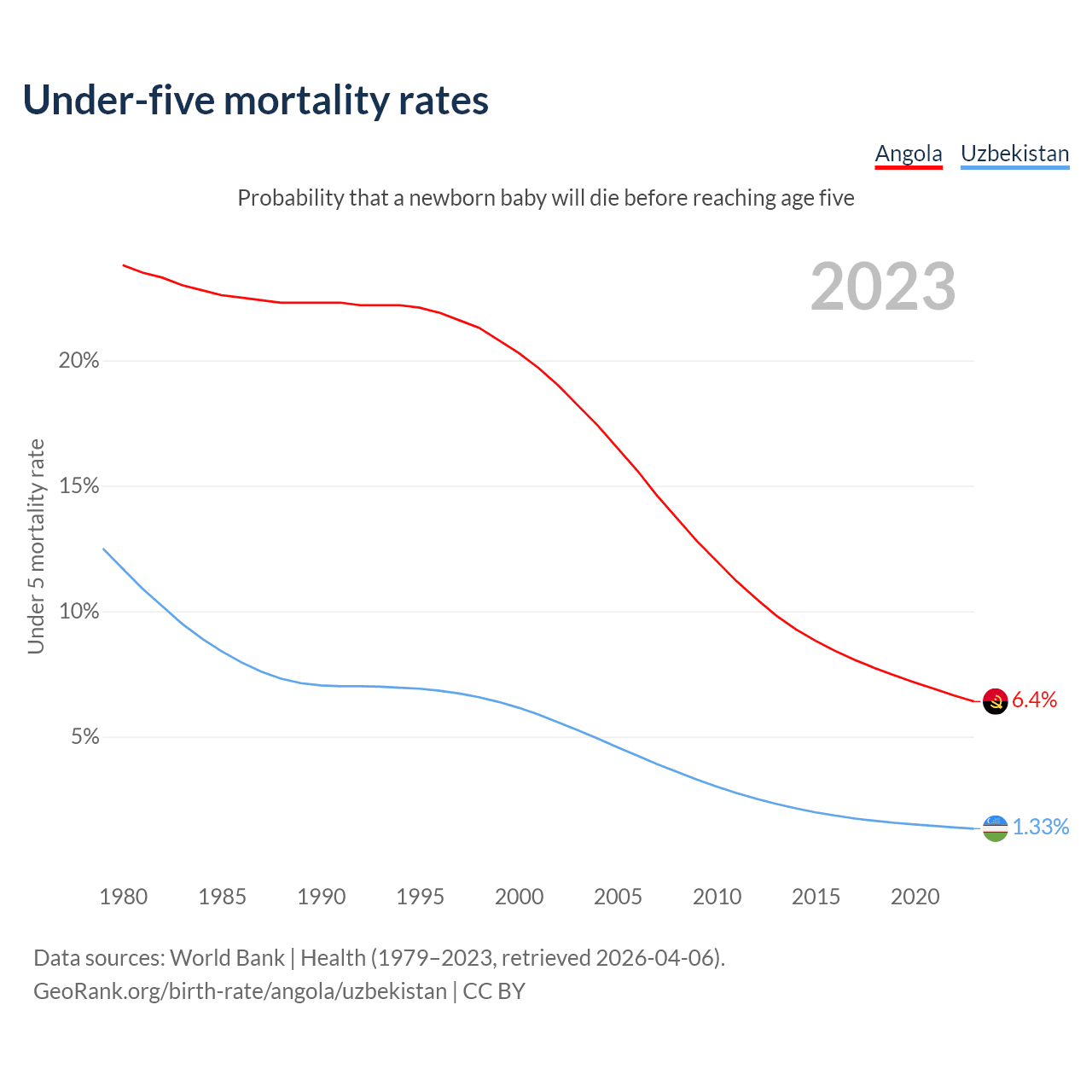 The chance that a newborn baby will die before reaching age five is 6.4% in Angola and 1.33% in Uzbekistan. Above is a chart with historical data on under-five mortality rates.