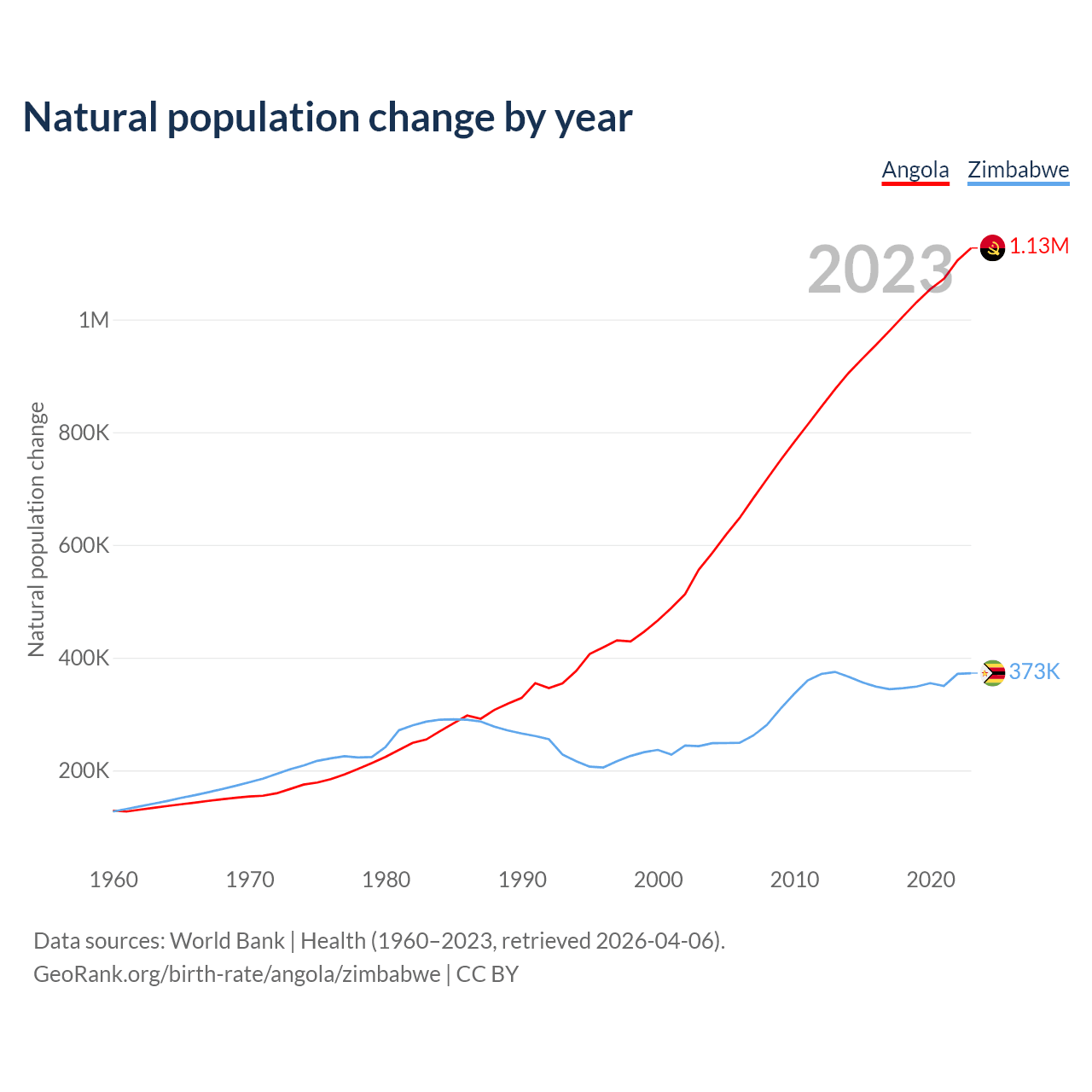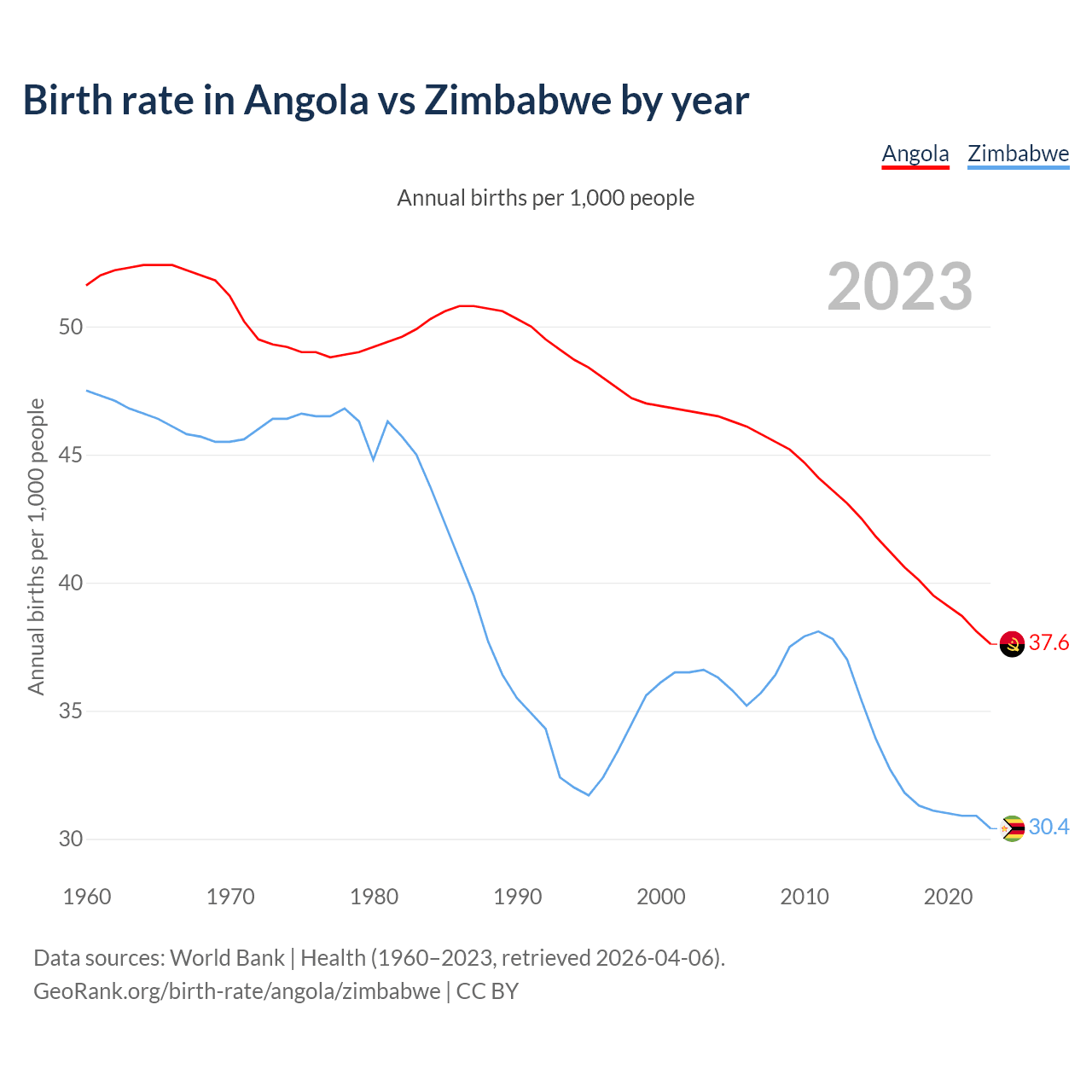 Angola has an annual birth rate of 37.6 births per 1,000 people, compared to 30.4 for Zimbabwe. The average number of children a woman is expected to have during her lifetime — the fertility rate, is 5.12 in Angola and 3.72 in Zimbabwe — 27.3% difference.