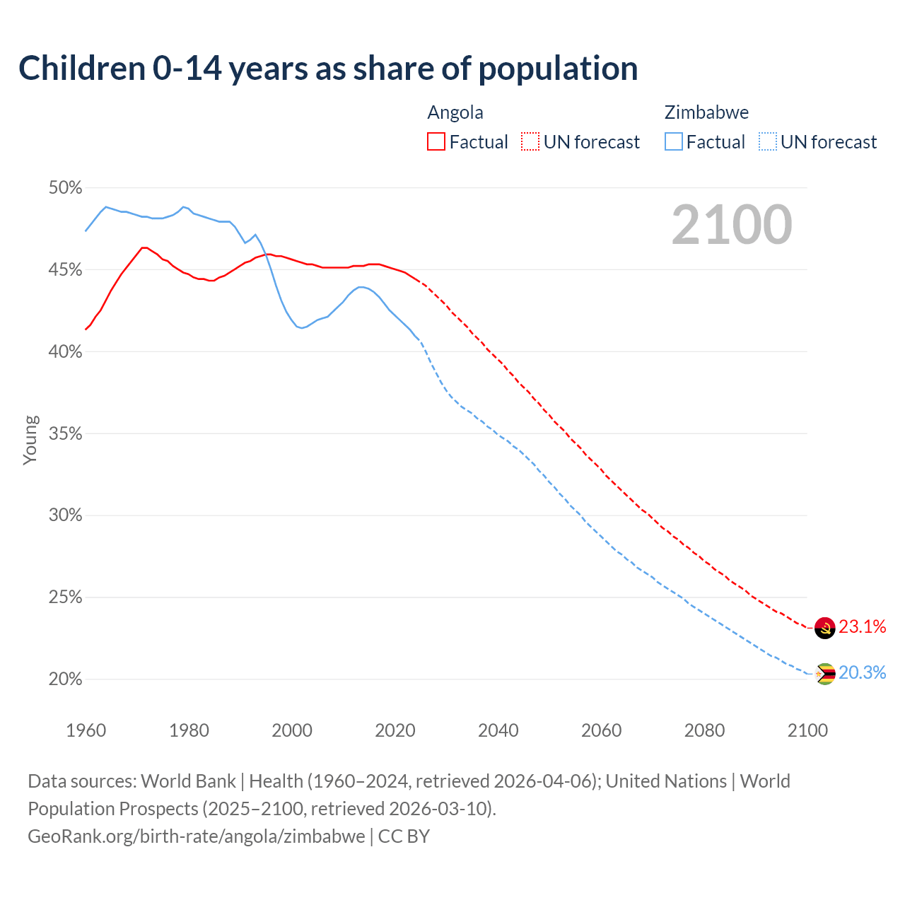 According to the latest available data on birth rates, the fertility rate in Angola was 5.12 children per woman in 2023, compared to 3.72 in Zimbabwe in 2023. The replacement level is considered to be 2.1 children per woman.