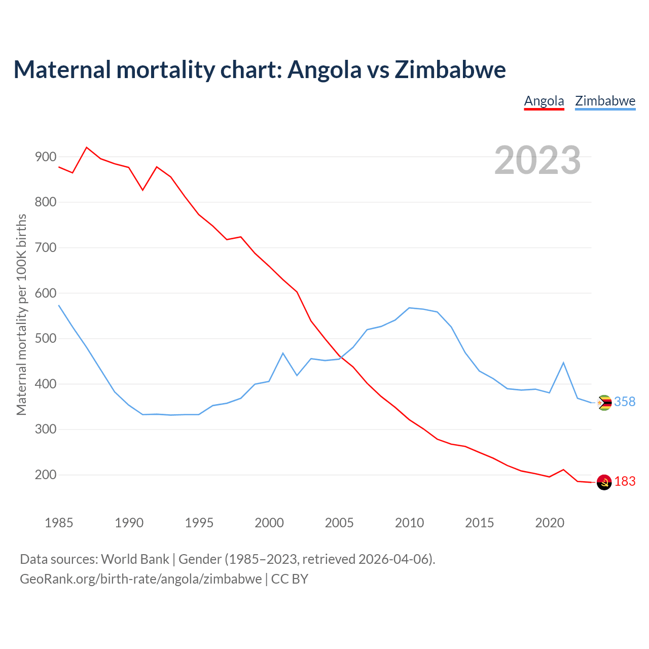 The maternal mortality rate, which is the probability of dying during childbirth or within 42 days of pregnancy termination, is 183 deaths per 100,000 live births in Angola, compared to 358 deaths in Zimbabwe.