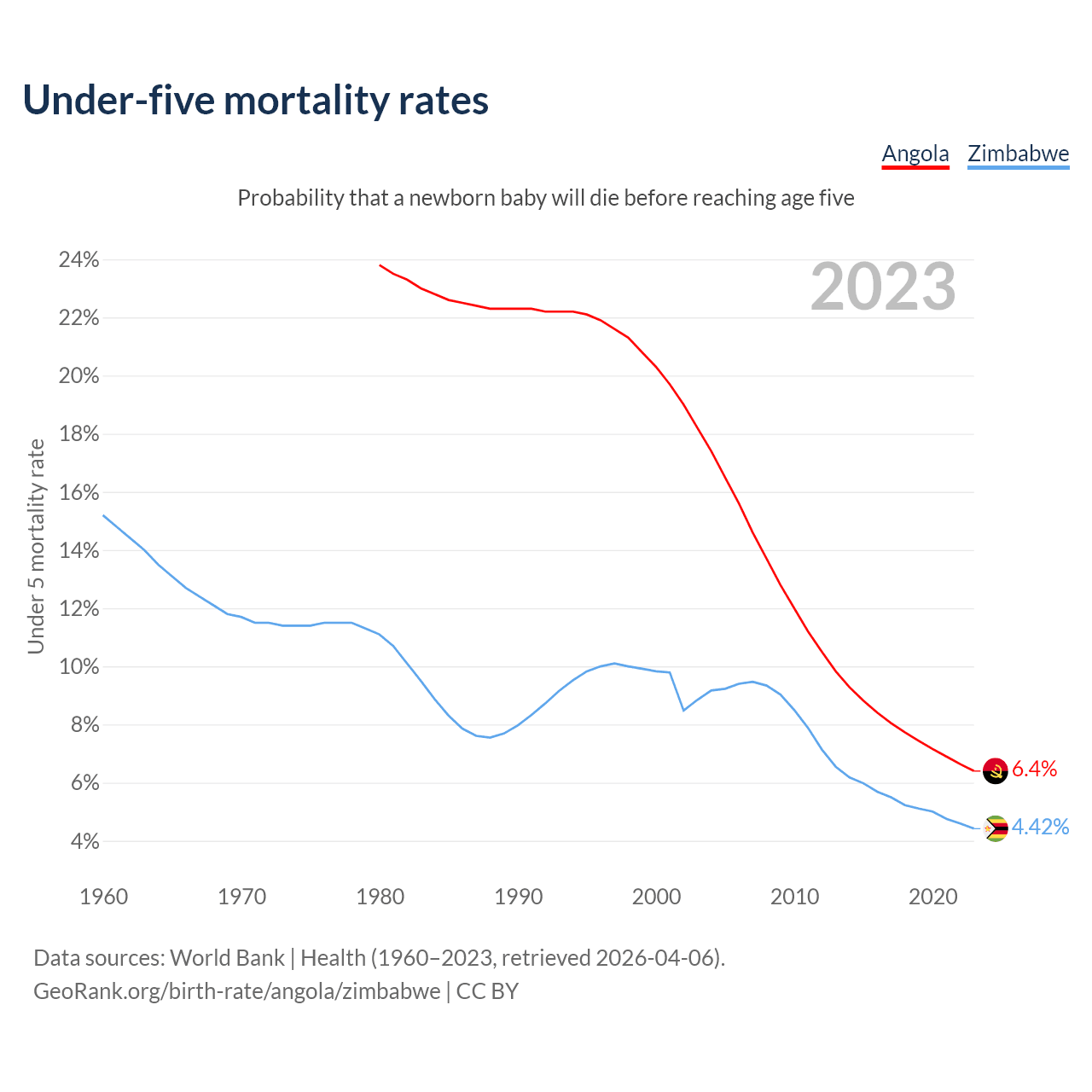 The chance that a newborn baby will die before reaching age five is 6.4% in Angola and 4.42% in Zimbabwe. Above is a chart with historical data on under-five mortality rates.
