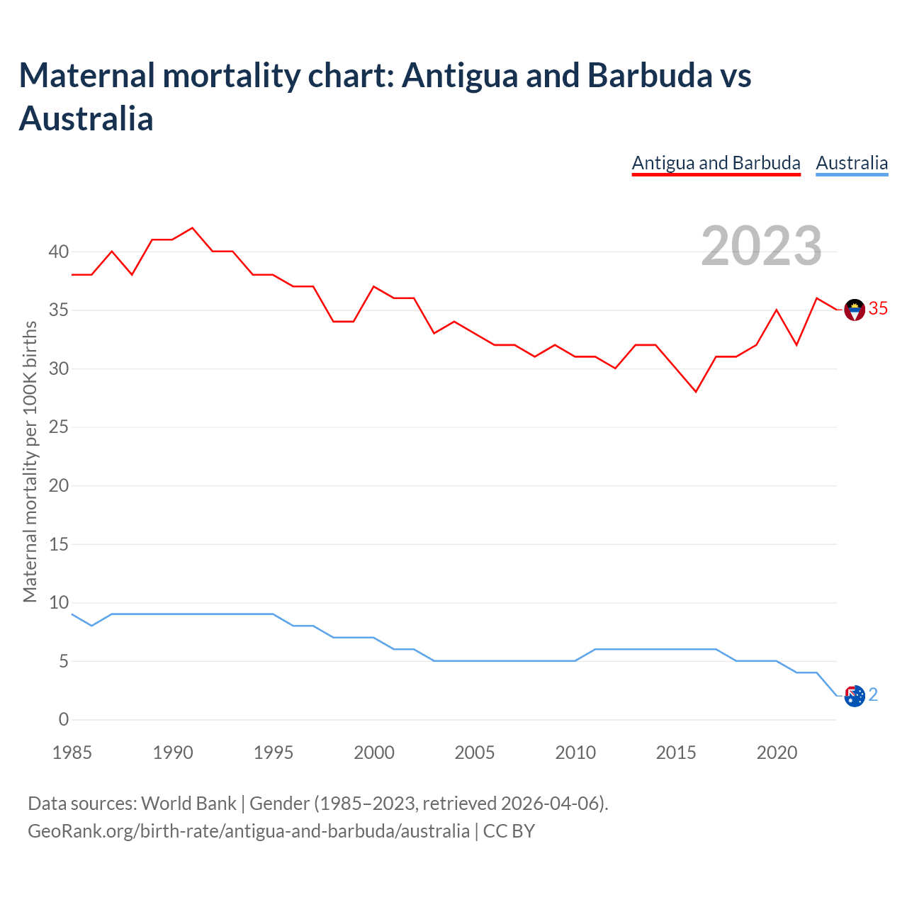 The maternal mortality rate, which is the probability of dying during childbirth or within 42 days of pregnancy termination, is 35 deaths per 100,000 live births in Antigua and Barbuda, compared to 2 deaths in Australia.