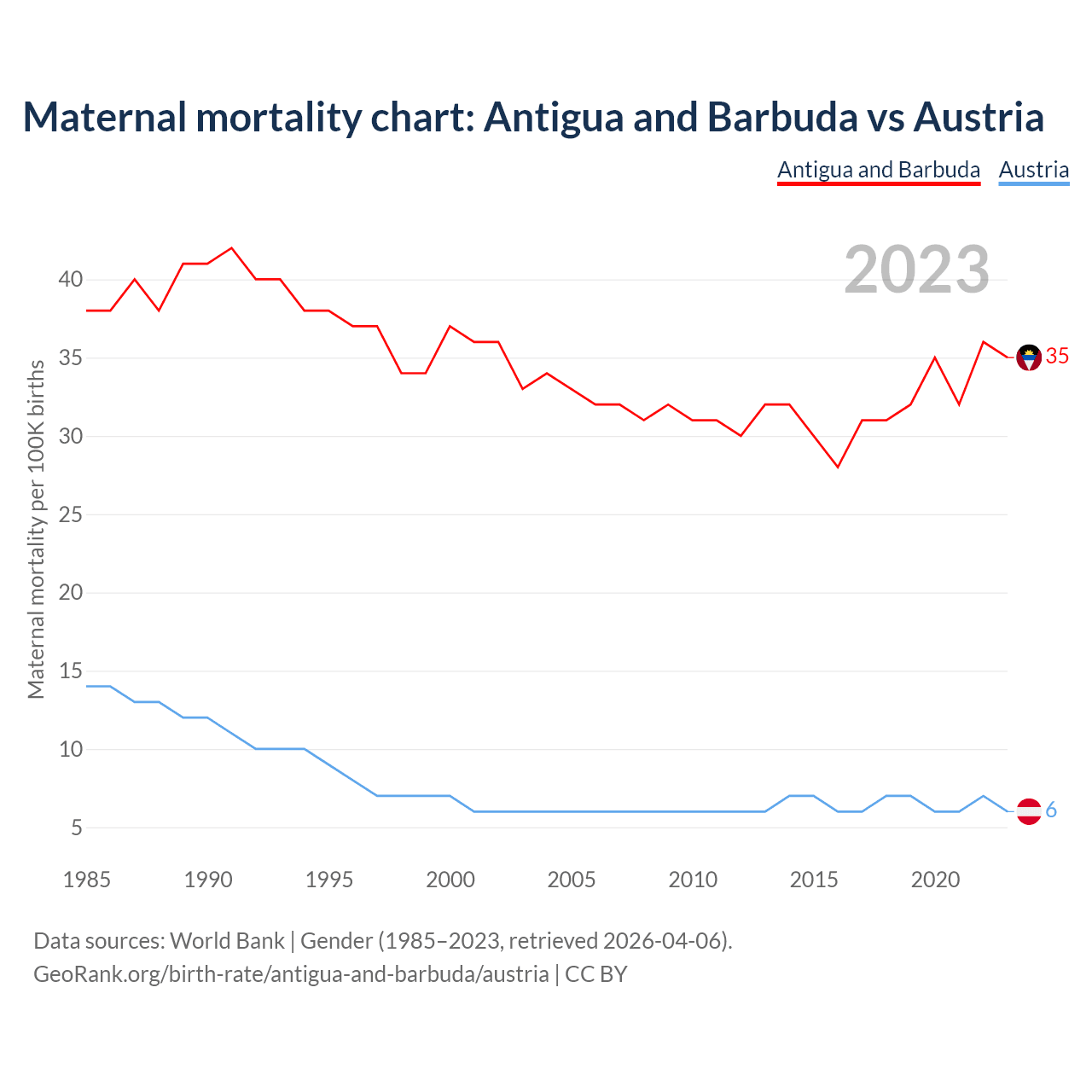 The maternal mortality rate, which is the probability of dying during childbirth or within 42 days of pregnancy termination, is 35 deaths per 100,000 live births in Antigua and Barbuda, compared to 6 deaths in Austria.