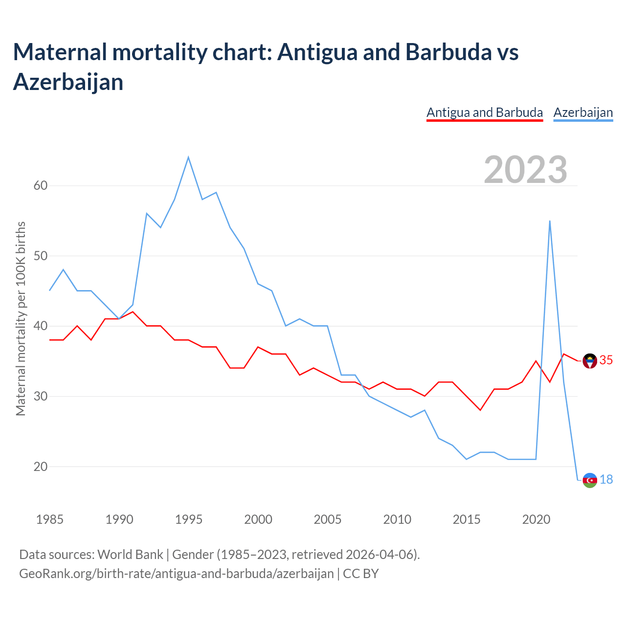 The maternal mortality rate, which is the probability of dying during childbirth or within 42 days of pregnancy termination, is 35 deaths per 100,000 live births in Antigua and Barbuda, compared to 18 deaths in Azerbaijan.