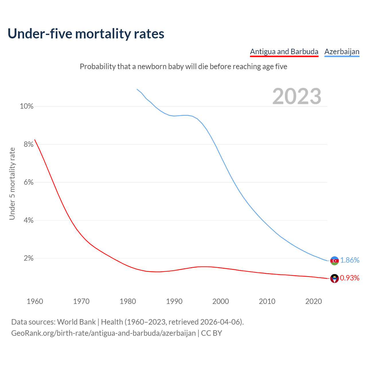 The chance that a newborn baby will die before reaching age five is 0.93% in Antigua and Barbuda and 1.86% in Azerbaijan. Above is a chart with historical data on under-five mortality rates.