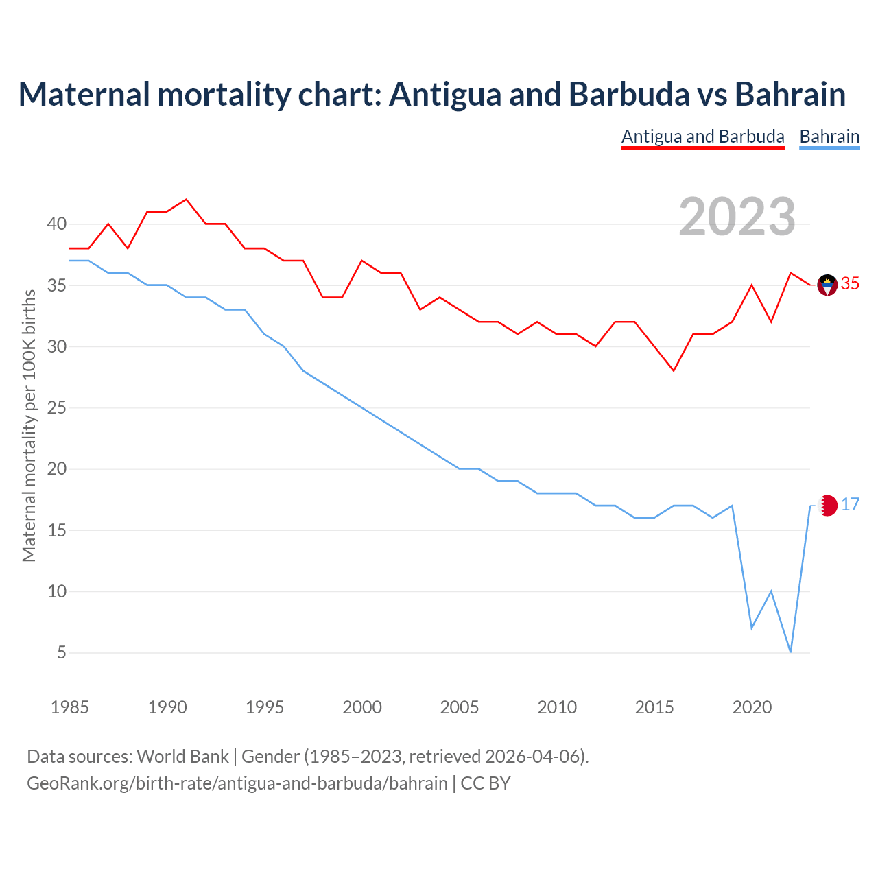 The maternal mortality rate, which is the probability of dying during childbirth or within 42 days of pregnancy termination, is 35 deaths per 100,000 live births in Antigua and Barbuda, compared to 17 deaths in Bahrain.