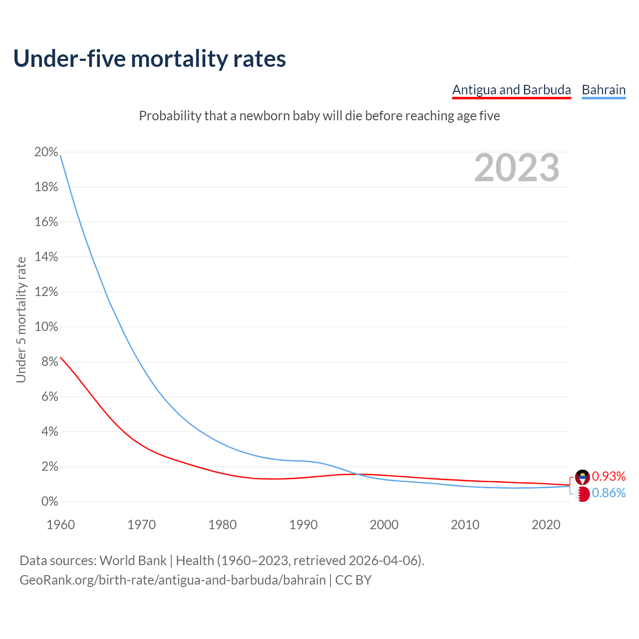 The chance that a newborn baby will die before reaching age five is 0.93% in Antigua and Barbuda and 0.86% in Bahrain. Above is a chart with historical data on under-five mortality rates.