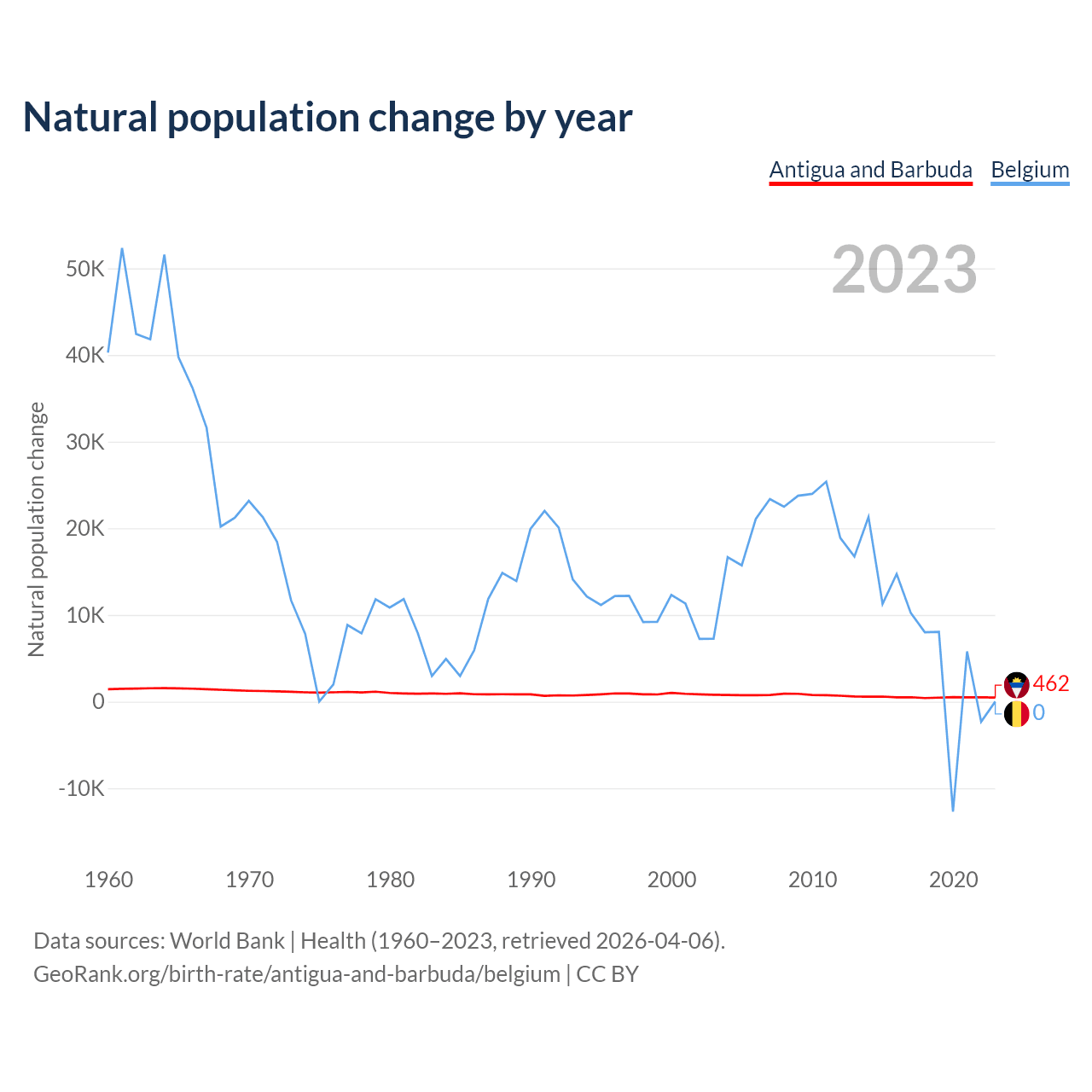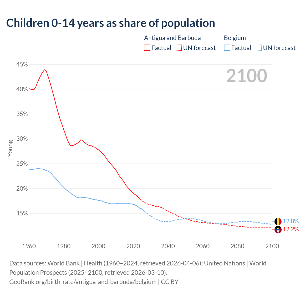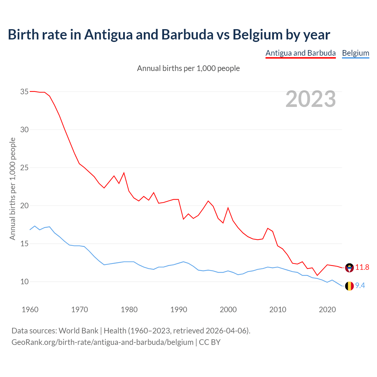 According to the latest available data on birth rates, the fertility rate in Antigua and Barbuda was 1.58 children per woman in 2023, compared to 1.47 in Belgium in 2023. The replacement level is considered to be 2.1 children per woman.