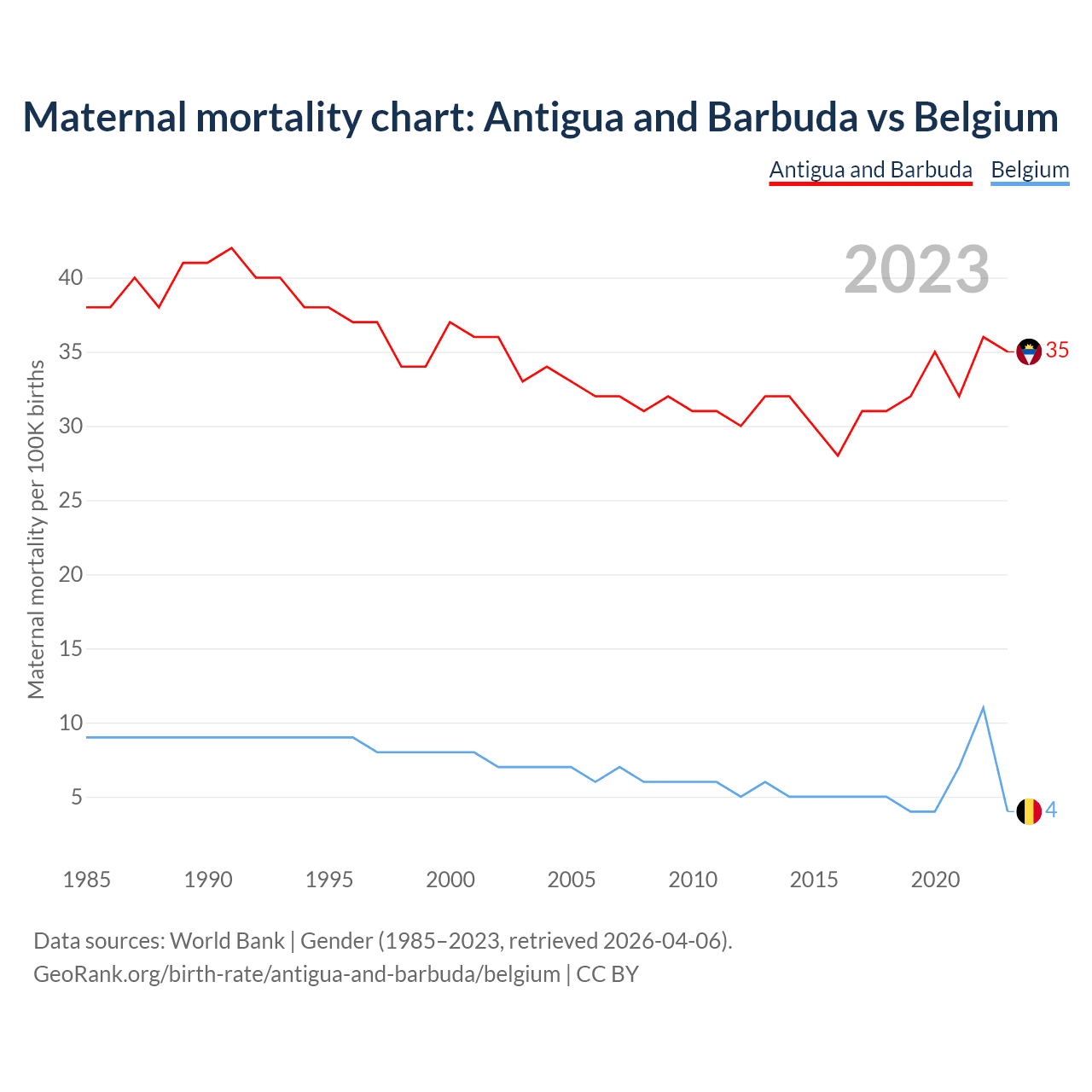 The maternal mortality rate, which is the probability of dying during childbirth or within 42 days of pregnancy termination, is 35 deaths per 100,000 live births in Antigua and Barbuda, compared to 4 deaths in Belgium.