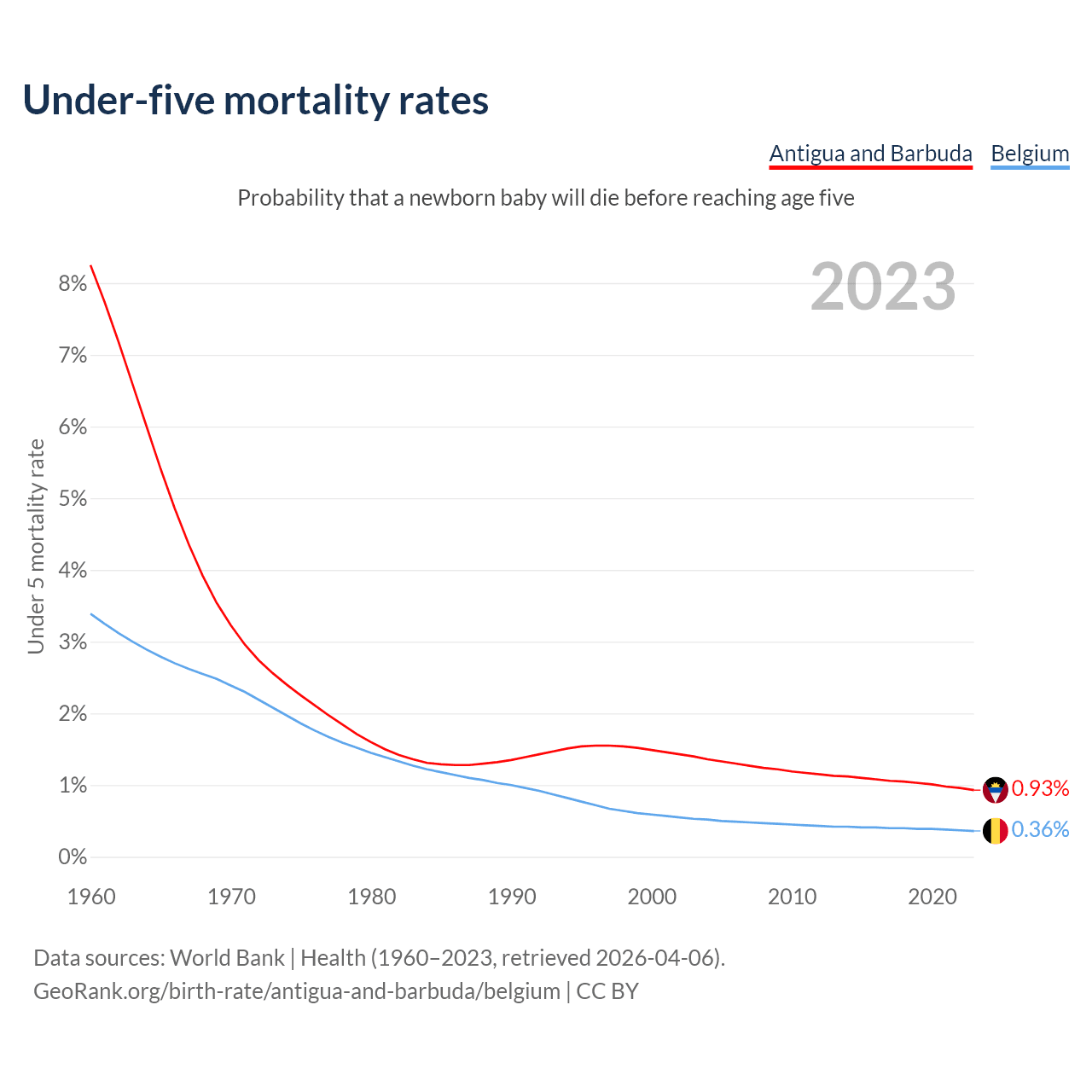 The chance that a newborn baby will die before reaching age five is 0.93% in Antigua and Barbuda and 0.36% in Belgium. Above is a chart with historical data on under-five mortality rates.